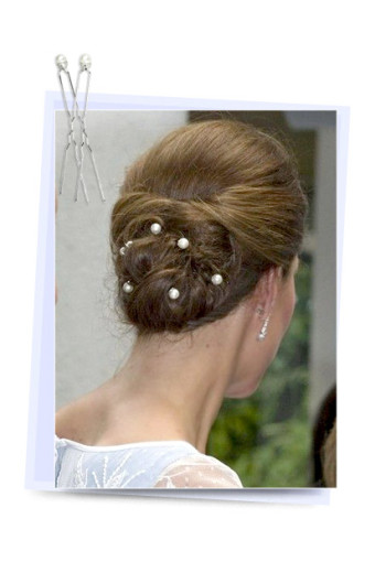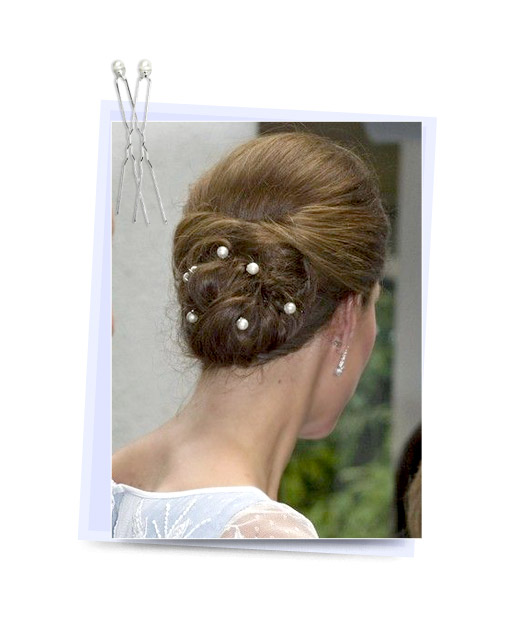 Nữ công tước xứ Cambridge cho chúng ta cảm hứng để thực hiện kiểu tóc đơn giản mà sang trọng này bằng những chiếc kẹp tăm có đầu đính ngọc trai. Hãy vấn tóc thành búi và cố định bằng những chiếc kẹp tăm rải rác như trong ảnh là bạn đã có ngay một kiểu tóc “hoàng gia” rồi nhé.