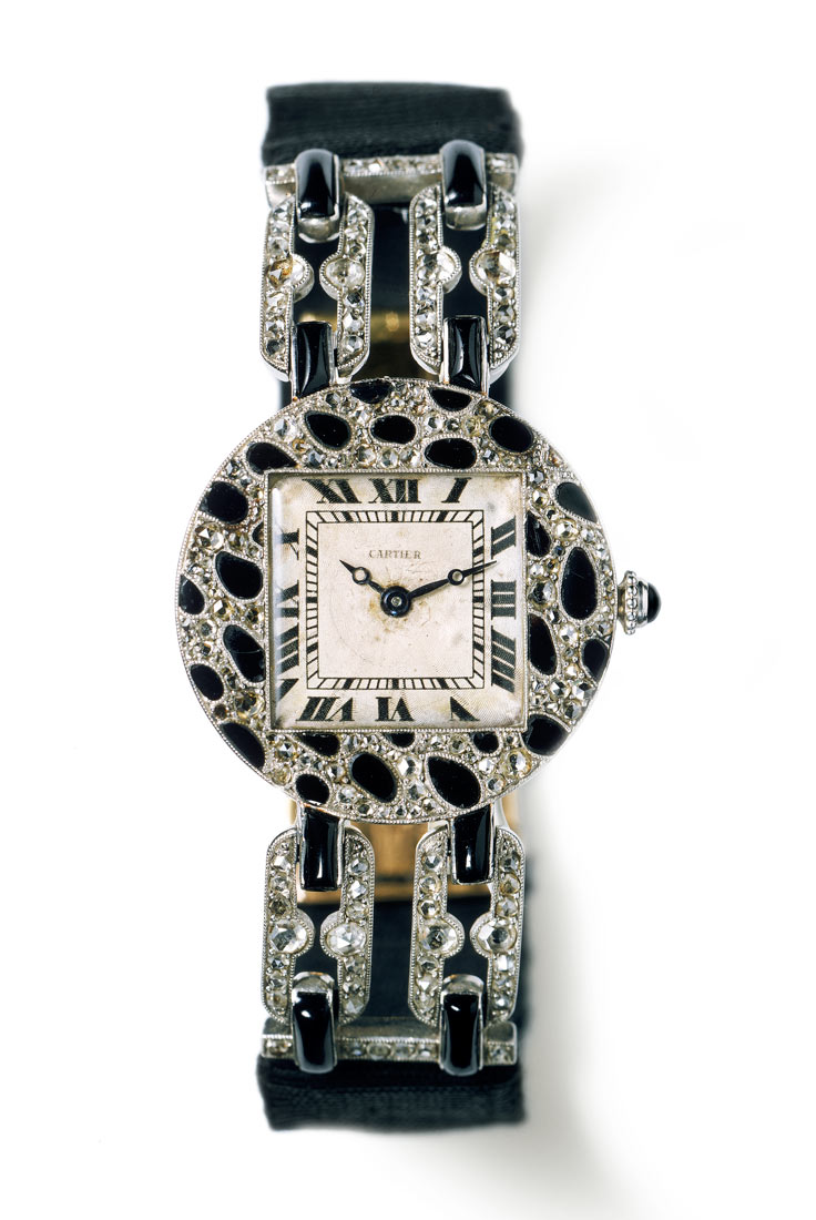 1914: Đồng hồ đeo tay với dây và mặt trang trí họa tiết đốm của loài báo. Mặt tròn bằng chất liệu bạch kim. Đính kim cương cắt dáng hoa hồng và đá mã não.