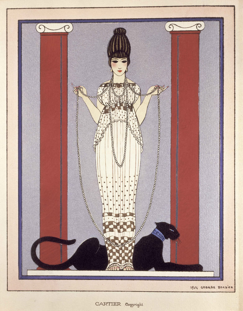 Mẫu thiệp mời dùng trong các quảng cáo của Cartier. Họa sỹ Georges Barbier vẽ người phụ nữ thanh lịch mặc đầm suôn Poiret và chú báo đen nằm phục dưới chân.