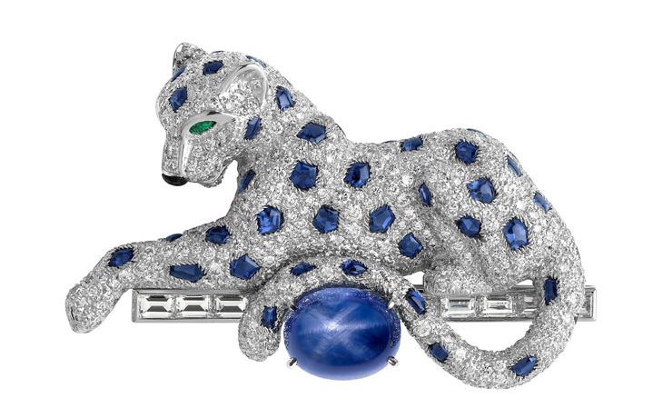 Một chiếc trâm cài áo cẩn kim cương, đá sapphire và emerald. Điểm nhấn là viên sapphire xanh cắt cabochon có ngôi sao 6 cánh. Đây là một trong những chiếc trâm cài áo đặc sắc nhất Cartier từng thiết kế. Giá trị ước tính từ 125,000 đến 175,000 đô-la Mỹ theo viện đấu giá Sotheby’s.