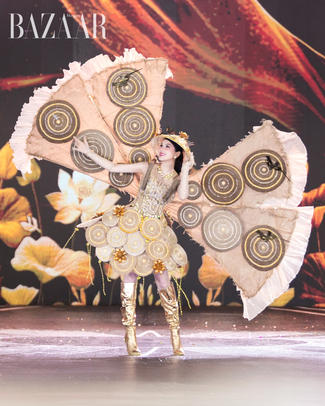 Hoa hậu Lê Hoàng Phương một lần nữa khiến khán giả phấn khích khi trở lại sân khấu đêm thi Trang phục Văn hoá Dân tộc. Cô diện thiết kế có tên Thăng Long Hội, lấy cảm hứng từ nghệ thuật múa rối nước, tái hiện hình ảnh những mái đình tráng lệ bên hồ, phản chiếu tâm hồn sáng tạo và tinh thần Việt.