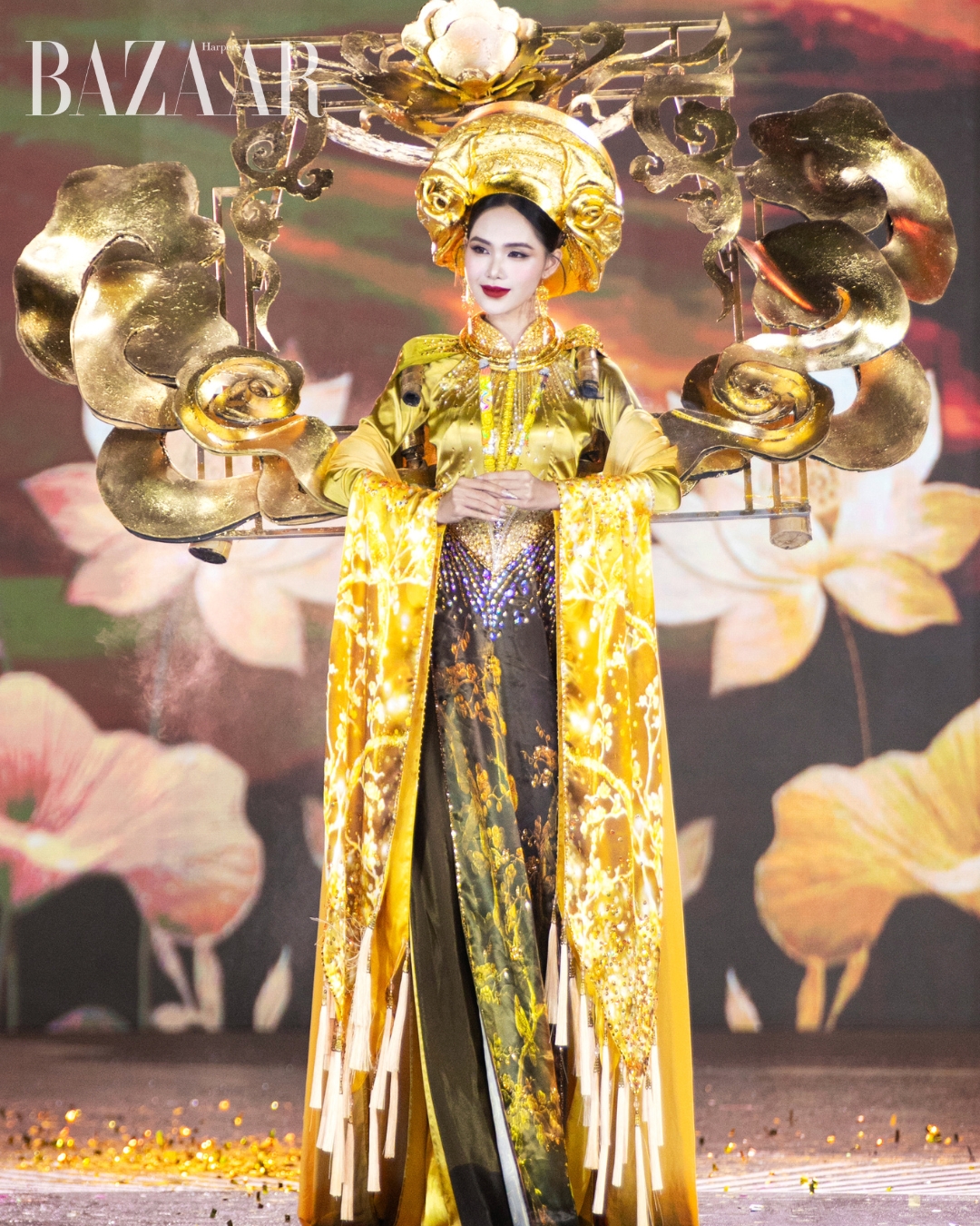 Hoa hậu Trần Tiểu Vy kết màn với thiết kế có tên Cửu Hoa Nghinh Thánh. Bộ trang phục tôn vinh tín ngưỡng thờ Mẫu miền Tây Nam Bộ, đồng thời lan tỏa khát vọng về vùng đất thanh bình, mùa màng bội thu và hạnh phúc trọn vẹn.