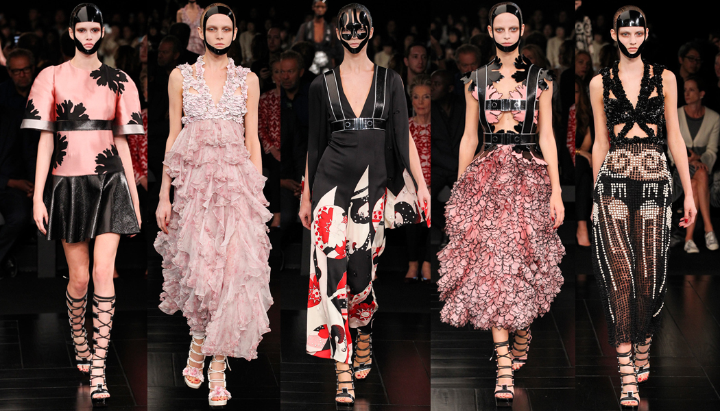 Các cô gái của Alexander McQueen bước ra mang vẻ lạnh lùng của những đấu sỹ Samurai, với kiểu tóc túm gọn thành búi phía sau và gương mặt bị đóng khung trong những mặt nạ mở bằng plastic đen bóng. Những thiết kế ở phần đầu hầu hết đều mang phom dáng góc cạnh, chất liệu cứng cáp, trông “đơ” như thể chúng có thể tự dựng đứng mà không cần cơ thể người mẫu. Hình ảnh kimono thấp thoáng ở ống tay áo dài và rộng, thắt lưng ngang eo và những bông hoa màu hồng, đen, đỏ nở rộ khắp trên bề mặt các thiết kế. Sarah Burton còn khéo léo tạo nên những khoảng hở quyến rũ bằng các đường xẻ nơi cổ và ống tay áo, một số còn điểm thêm dây khóa kéo.
