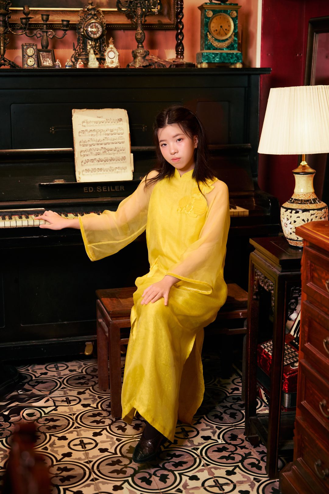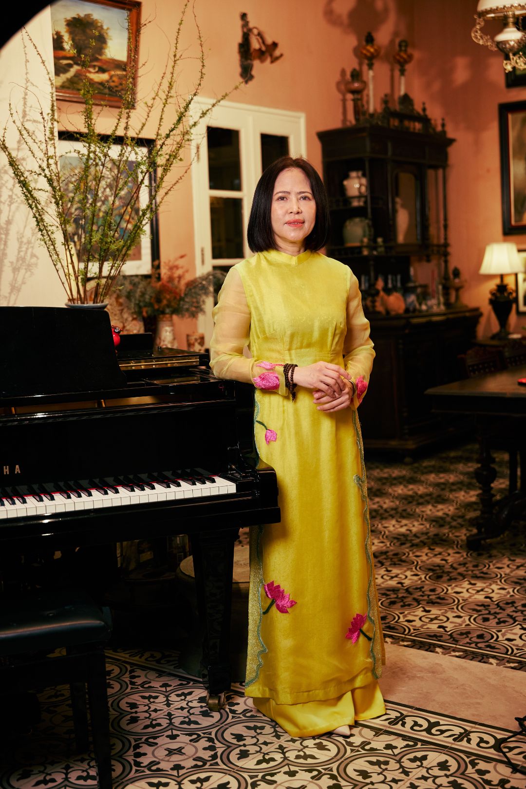 Từ những đường kim mũi chỉ thêu dệt nên đóa hoa, cho đến những dải lụa mềm mại ôm lấy cơ thể, tất cả đều gửi gắm lời chúc về một năm mới an khang, nơi yêu thương luôn được đặt lên hàng đầu.