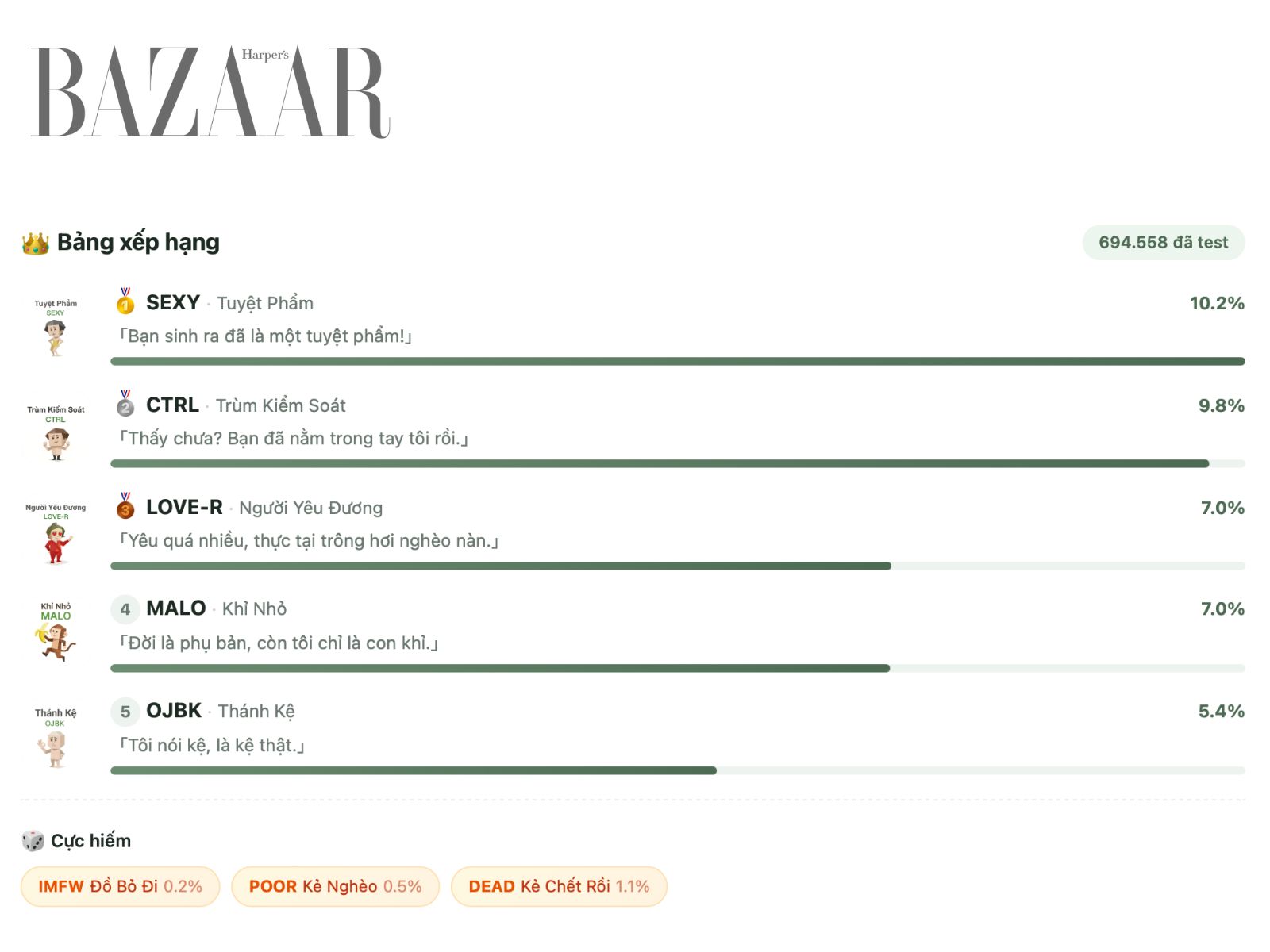 Về bản chất, nó mượn khung của MBTI nhưng cố tình bẻ lái hoàn toàn. Thay vì phân loại bạn theo hướng nội hay trực giác, kết quả có thể là “JOKE-R” (chúa hề), thậm chí là cả “DEAD” (chết lâm sàng).