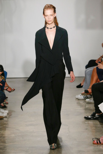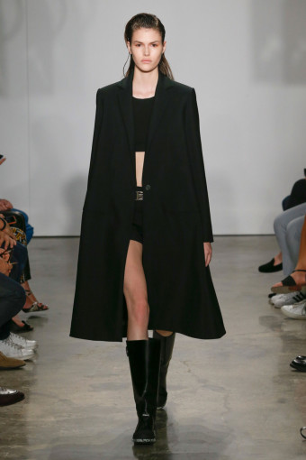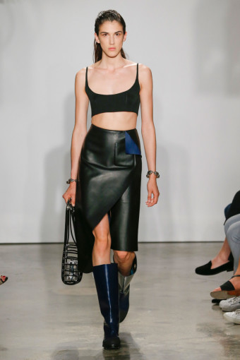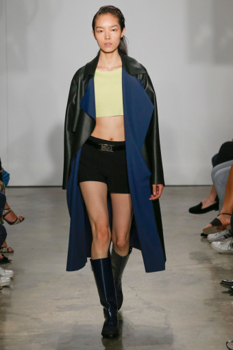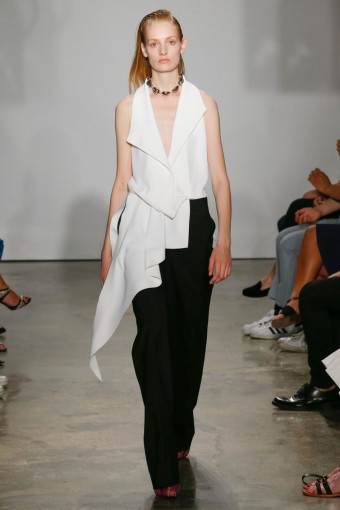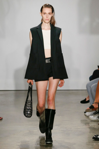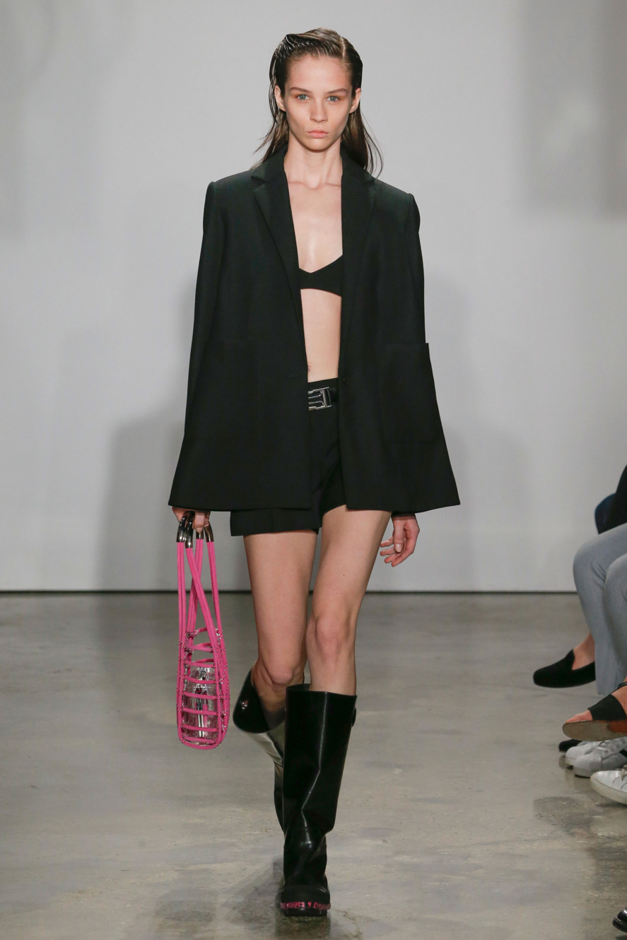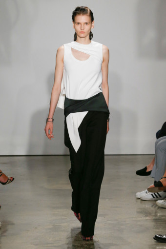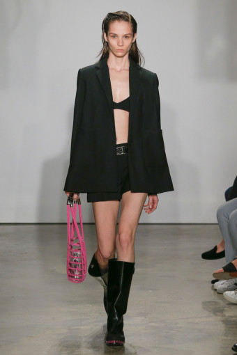 Trong khi những trang phục phần đầu là quần shorts cực ngắn mặc cùng áo bandage hoặc crop top mát mẻ, ẩn trong những chiếc áo khoác dài thì nửa sau bộ sưu tập là những thiết kế có phần trang trọng hơn. Đó là loạt áo blouse và áo khoác vạt chéo nhọn tam giác xếp nếp đổ dọc một bên như hình dạng cánh buồm. Alexander Wang kết hợp chúng cùng quần tây ống đứng để các quý cô Balenciaga có ngay trang phục dự tiệc thoải mái kể cả trong các kỳ nghỉ.
