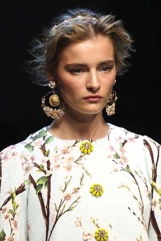 Nếu tại show của Zac Posen, mái tóc của các người mẫu được vấn cao bồng bềnh và đính hoa ngẫu hứng thì Dolce & Gabbana lại tạo những vòng hoa cài đầu ẩn hiện trong búi tóc như trang sức.