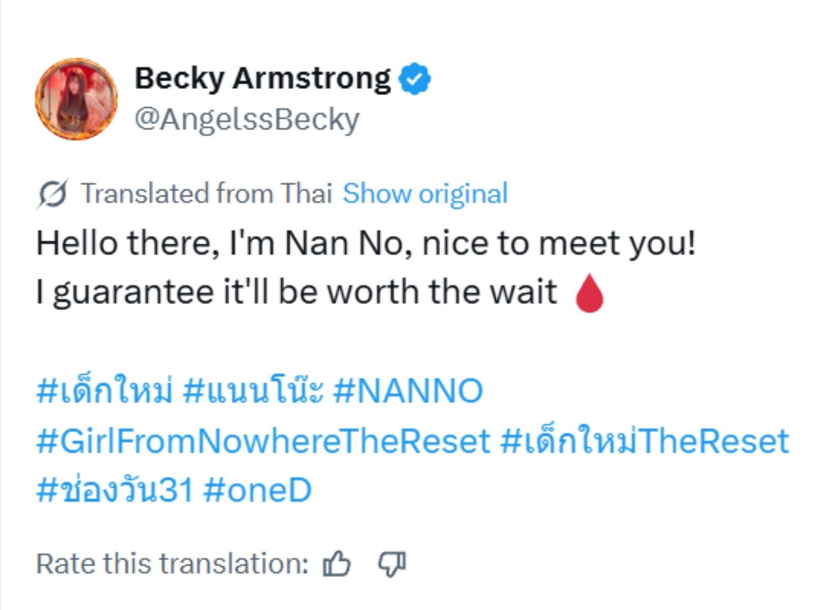 Để khẳng định vị thế mới, trên nền tảng X (Twitter), Becky Armstrong gửi lời chào đầy thách thức: “Hello, Nanno here. Nice to meet you. Guaranteed to deliver… worth the wait” (Chào, Nanno đây. Rất vui được gặp bạn. Đảm bảo sẽ không làm bạn thất vọng).
