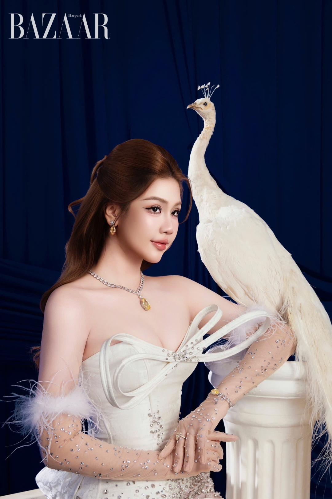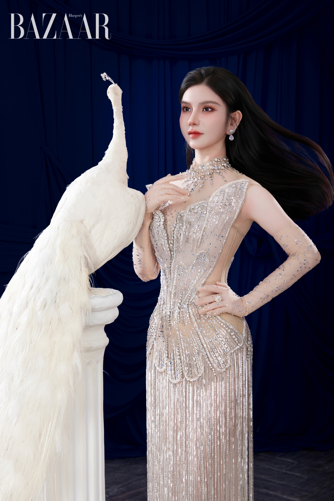 Xuất hiện trong bộ ảnh, Trưởng BGK Lý Nhã Kỳ, Hoa hậu Đại dương Việt Nam 2017 Lê Âu Ngân Anh và đương kim Hoa hậu Hoàn vũ Việt Nam 2025 Phương Linh khoe sắc rực rỡ cùng trang phục, bối cảnh tông trắng – xanh đặc trưng của Miss Cosmo. Concept vương giả với không gian sang trọng nhưng tối giản, cùng chú chim công trắng làm nổi bật thần thái tự tin và ánh nhìn bản lĩnh của những người phụ nữ lãnh đạo.