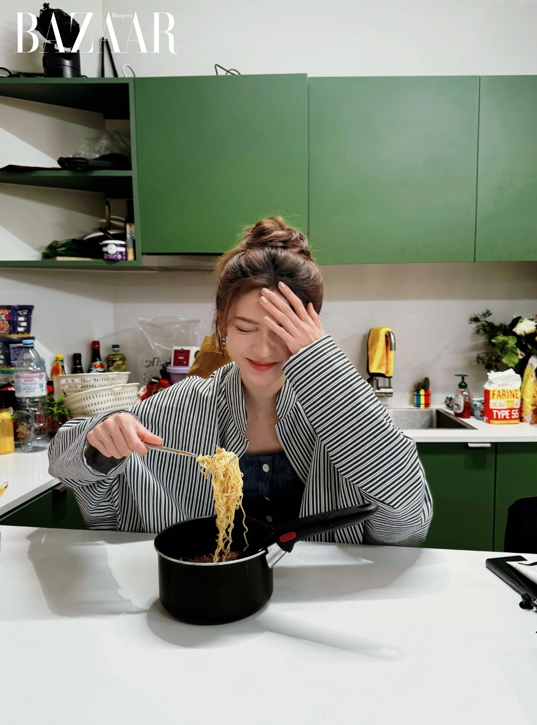 Khi phải tẩy nhuộm hay uốn tóc vì công việc, sợi tóc bị hư tổn nặng hơn bình thường. Lúc này, cô kết hợp ủ dầu bằng mũ tắm để dưỡng chất thẩm thấu sâu hơn, phục hồi hiệu quả hơn.