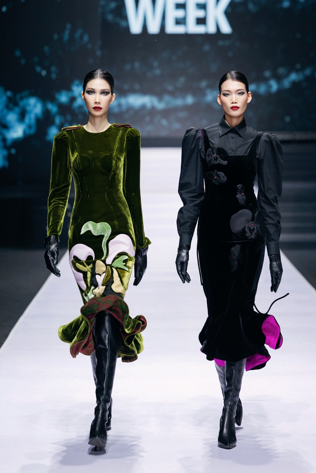 Sàn catwalk mở màn với Huỳnh Tú Anh, Quán quân The Face Vietnam 2023, trong chiếc đầm nhung đen phủ voan dài như làn khói, đôi boots cao cổ cùng chi tiết hoa lan đính thủ công. Từng sải bước của cô khơi dậy hình ảnh nữ tướng hiện đại mạnh mẽ mà vẫn duy mỹ, rực sáng trong lớp lót đỏ ruby như ngọn lửa nội tâm bùng cháy giữa đêm đen. Sau hành trình chinh phục Tuần lễ thời trang Milan, Tú Anh tiếp tục chứng minh bản lĩnh của người mẫu Việt trên sàn diễn quốc tế, đồng thời thể hiện trọn vẹn tinh thần mà Black Parade gửi gắm.