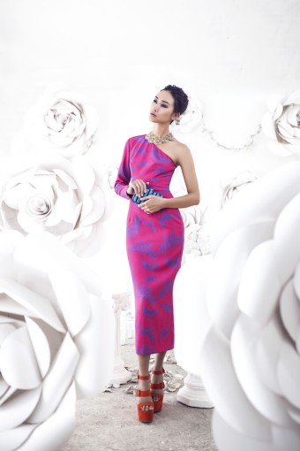 Đầm, Đỗ Mạnh Cường; Giày, Jimmy Choo; Vòng cổ, Dior; Ví cầm tay, Salvatore Ferragamo