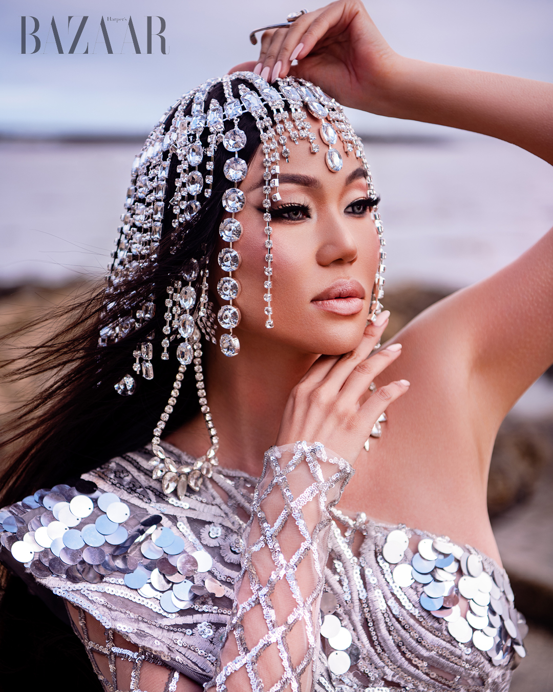 ELVIRA – Đầm: Anna Gupta Couture. Bông tai: Debora Malouf, Viva StyleHouse. Vòng tay: Ary D’po. Nhẫn: Coco + Peach, Viva StyleHouse.