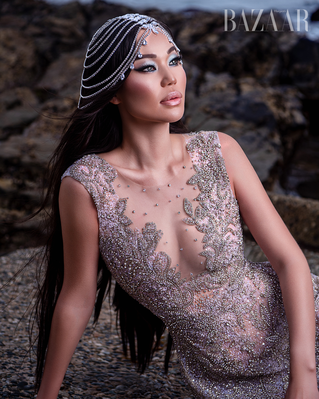 ELVIRA – Áo bra, nhẫn và cài tóc: Lada Legina, Viva StyleHouse. Váy: Anna Gupta Couture. Áo khoác kimono: Anna Gupta Resort.