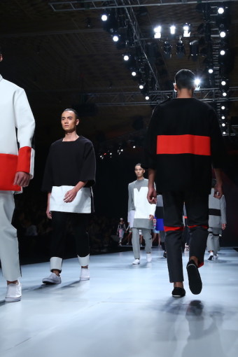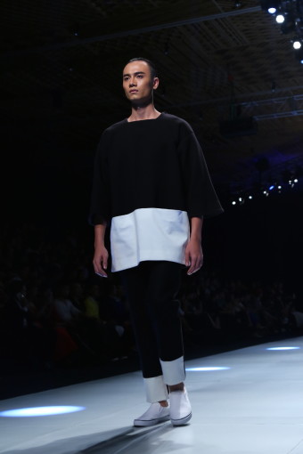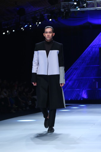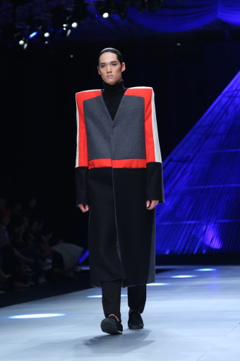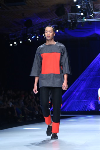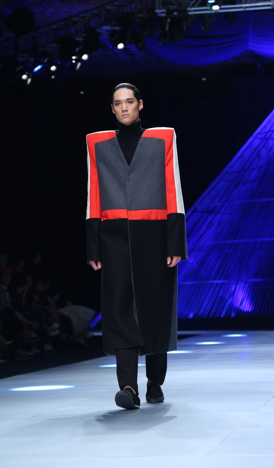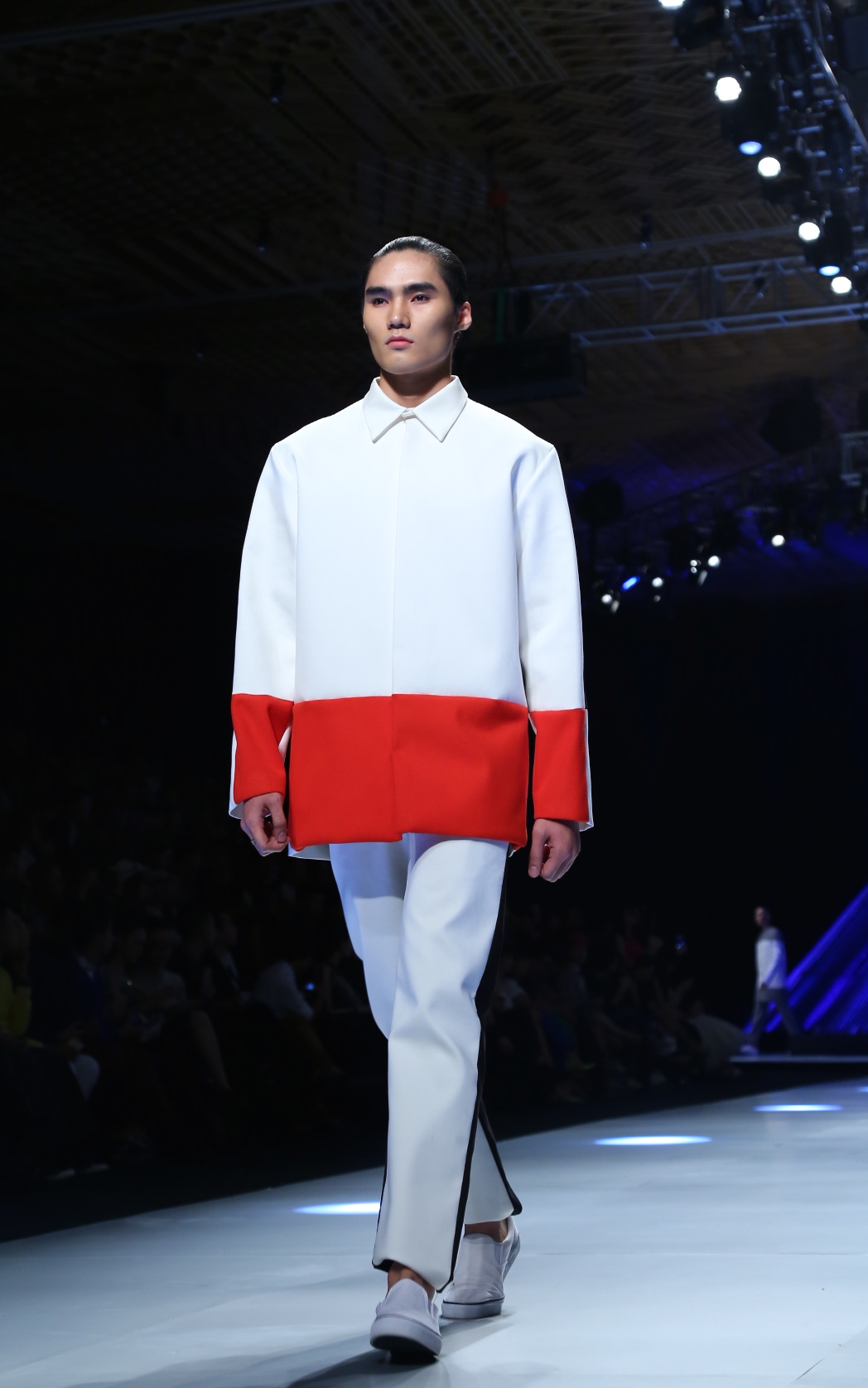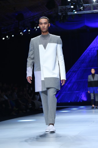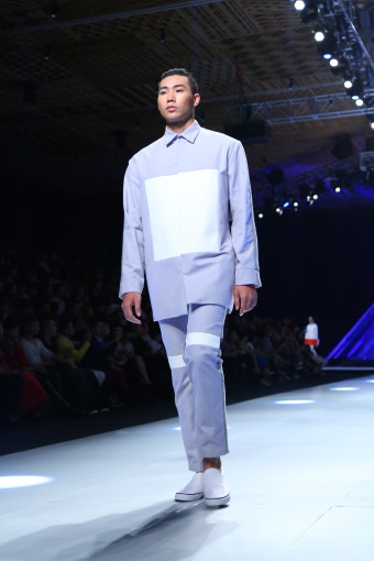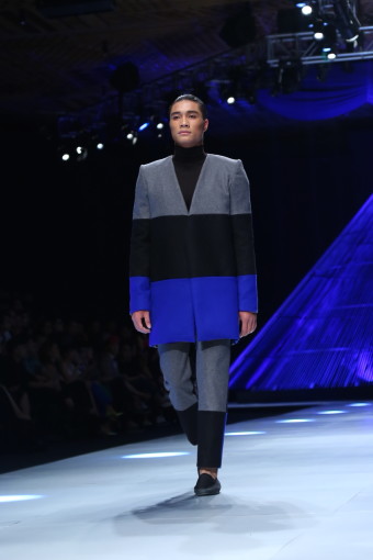 Các kết hợp màu sắc theo trào lưu color blocking làm nổi bật vẻ tươi trẻ đầy sức sống cho những trang phục trên nền tông xám, đen, trắng sâu lắng. Xuyên suốt bộ sưu tập, Lucie Lee đã chọn những sắc màu lạnh như xanh cobalt, xám… theo đúng tinh thần chủ đạo của mùa thời trang Thu – Đông 2014. 9 mẫu trang phục tối giản lại càng tôn nên vẻ nam tính, khí khái mà không mất đi chất tự do, phóng khoáng ở những người trẻ. Quang Đại là người mẫu được Lucie Lee chọn lựa mở màn cho show diễn.