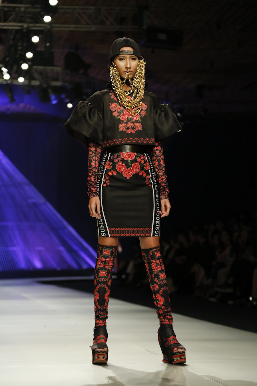 Nhưng cũng bằng ngần ấy nguyên liệu, khi kết hợp với nón snapback và dáng trang phục ngắn kết hợp với dài khoẻ khoắn lại tạo ra những cô nàng hiphop đường phố đương đại cá tính và độc đáo. Cứ như thế suốt bộ sưu tập của Issue, người ta thấy những ảo ảnh đan xen liên tiếp giữa những nguồn cảm hứng khác nhau nhưng lại hoà quyện một cách kỳ lạ đầy quái cảm.