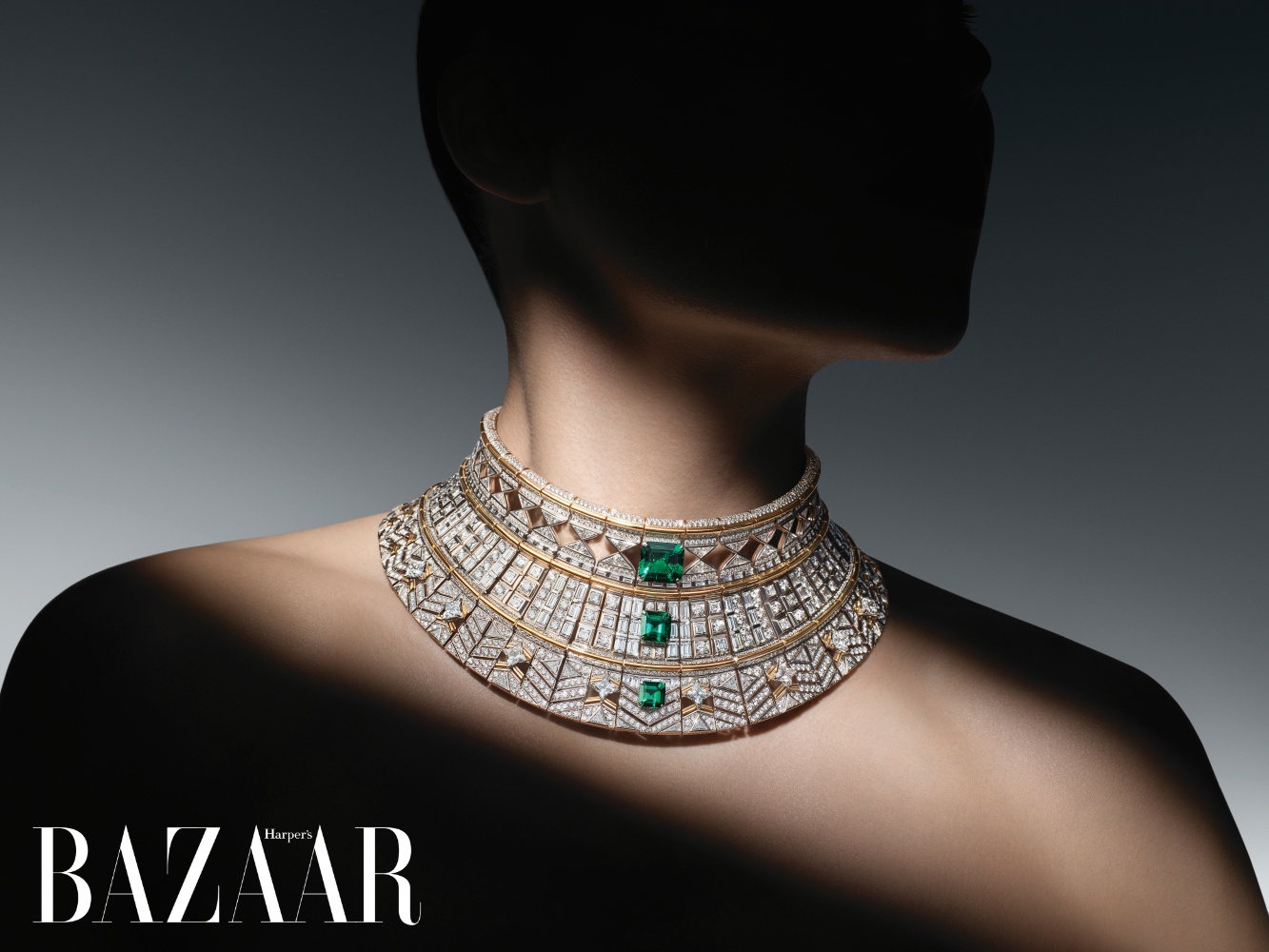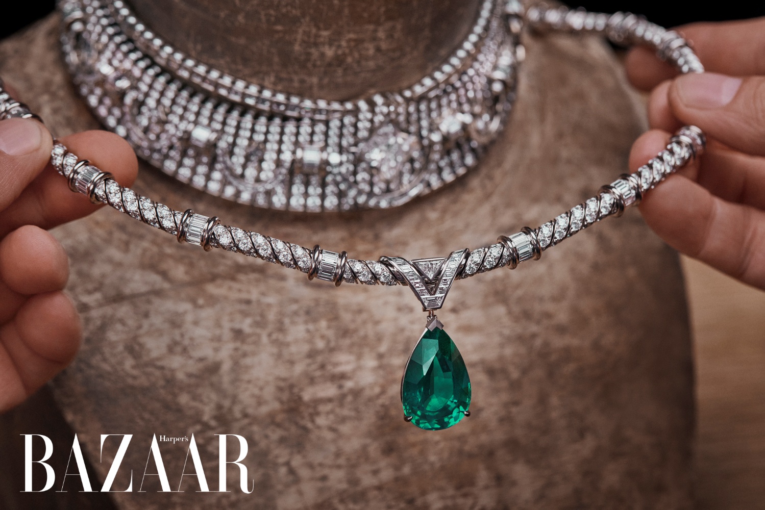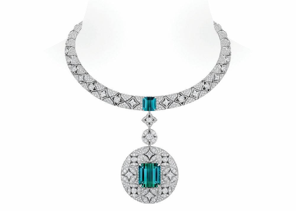 Vòng cổ Apogée với viên ngọc lục bảo Brazil, giác cắt quả lê nặng 30.75 carat. Tác phẩm vang vọng di sản của Louis Vuitton với các khớp nối đính kim cương gợi nhớ đến tay cầm của những chiếc rương di sản, kim cương xếp theo họa tiết Monogram và trung tâm là một viên kim cương nước D hoàn hảo, giác cắt LV Monogram Star độc quyền nặng 10.56 carat.