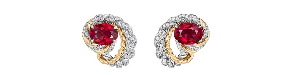Hoa tai Protection chế tác từ kim cương, vàng trắng và vàng vàng. Tâm điểm là hai viên hồng ngọc huyết bồ câu giác cắt oval nặng lần lượt 2.81 và 2.76 carat.