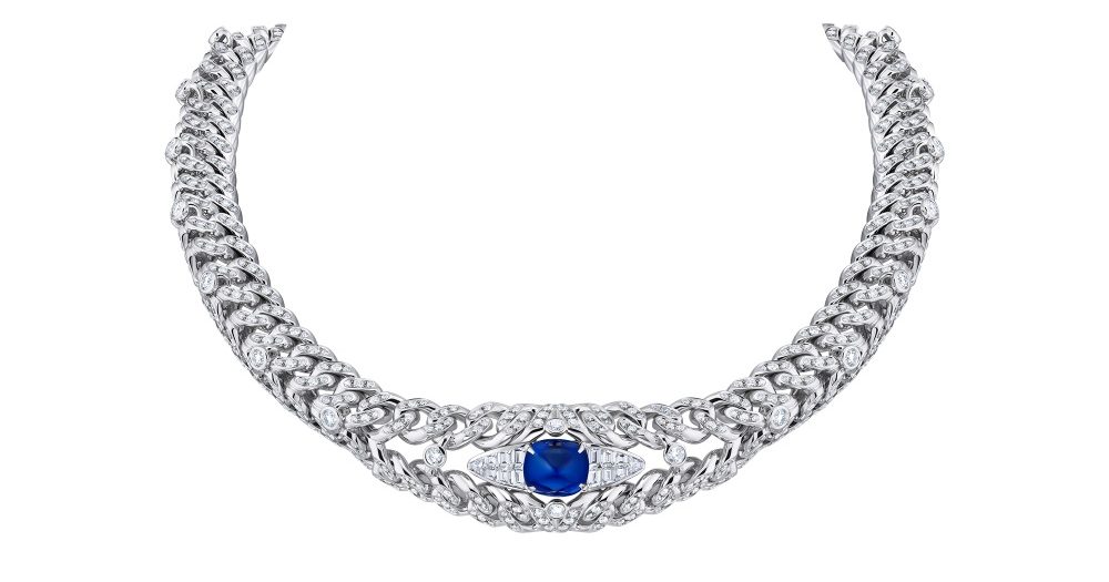 Vòng cổ Keeper với tâm điểm là viên sapphire xanh giác cabochon tròn, nặng 10.12 carat. Vòng đính kim cương theo hình tam giác, tôn vinh ký tự chữ V của Louis Vuitton và kim cương tròn gợi nhớ hình ảnh những chiếc đinh tán di sản của thương hiệu.