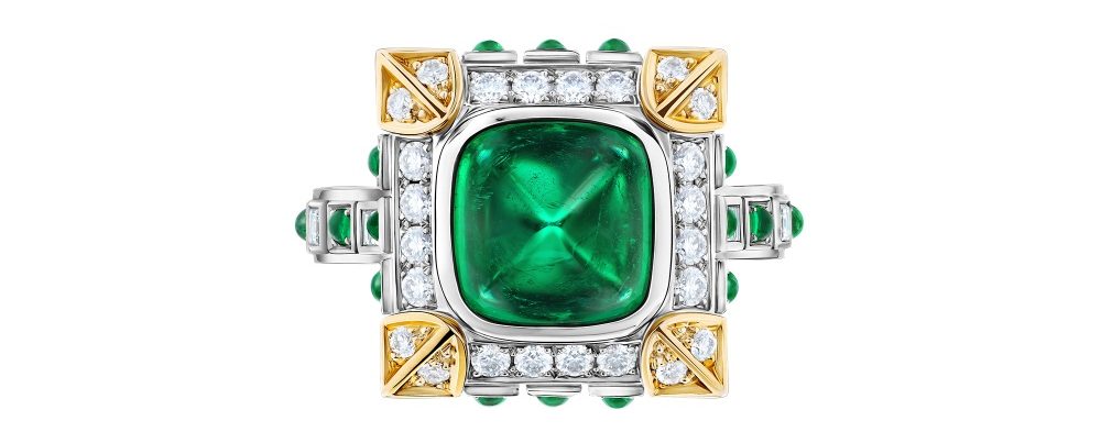 Nhẫn Monumental chế tác từ vàng vàng và vàng trắng, đính một viên ngọc lục bảo cabochon cắt dáng sugarloaf nặng 4.49 carat, 18 viên ngọc lục bảo cabochon nhỏ tổng trọng lượng 0.49 carat, cùng kim cương. Cách kết hợp kim cương và vàng vàng bốn góc tri ân đinh tán và bản lề những chiếc rương Louis Vuitton trứ danh.