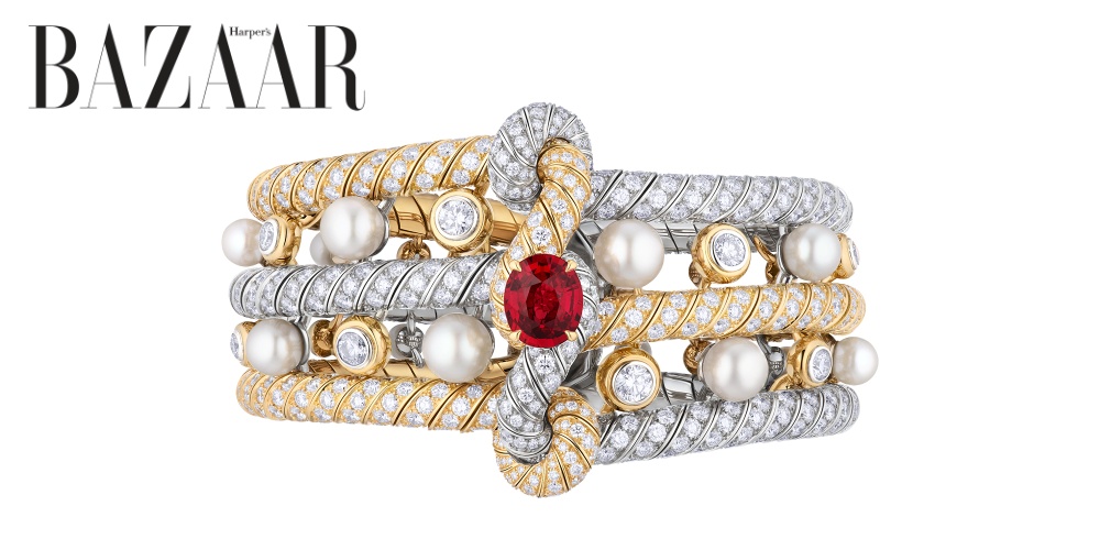 Vòng tay Connection, chế tác từ vàng vàng và vàng trắng, đính một viên hồng ngọc cắt dáng oval nặng 3.05 carat, 16 viên ngọc trai Akoya với tổng trọng lượng 21.10 carat, cùng kim cương.