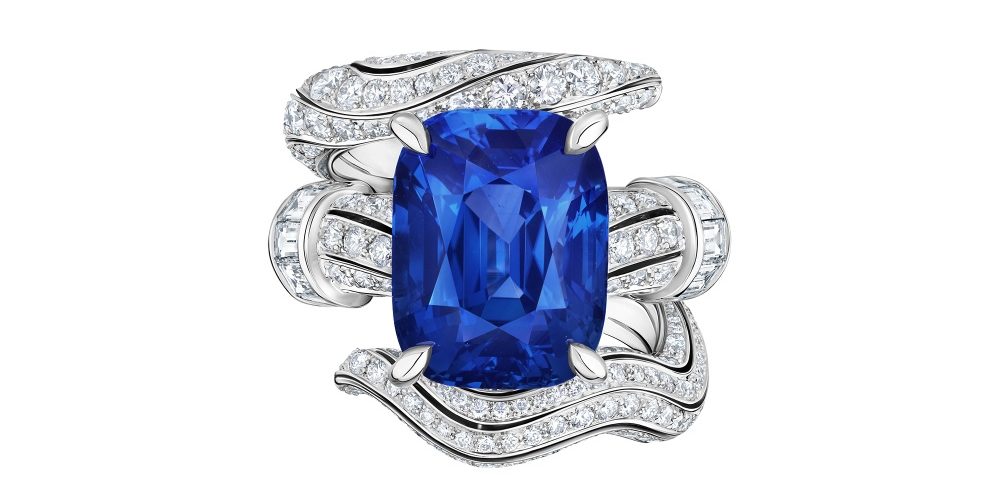 Nhẫn Motion, chế tác từ vàng trắng, đính một viên sapphire xanh cắt dáng cushion nặng 12.12 carat cùng kim cương.