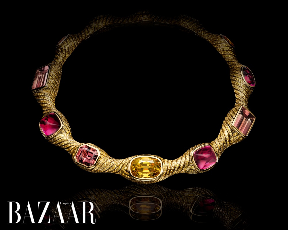 Vòng cổ Joy, chế tác từ vàng vàng với tổng trọng lượng 204.63 carat đá quý. Các viên đá quý mang nhiều kiểu cắt, màu sắc và hình dáng khác nhau, xoay quanh ba viên sapphire vàng nổi bật,phối cùng 10 viên tourmaline hồng. Kích thước đá quý dao động từ 10.06 carat đến 41.62 carat, trong khi màu sắc có thể thay đổi ngay trong cùng một viên đá – như tourmaline hai màu chuyển từ xanh sang hồng.Thiết kế dây xoắn – một chủ đề lặp lại và đóng vai trò nền tảng trong bộ sưu tập đỉnh sức Louis Vuitton Virtuosity – tiếp tục hiện diện trong phiên bản xoắn ốc mê hoặc không điểm dừng, biểu tượng cho sự tự do và thịnh vượng.