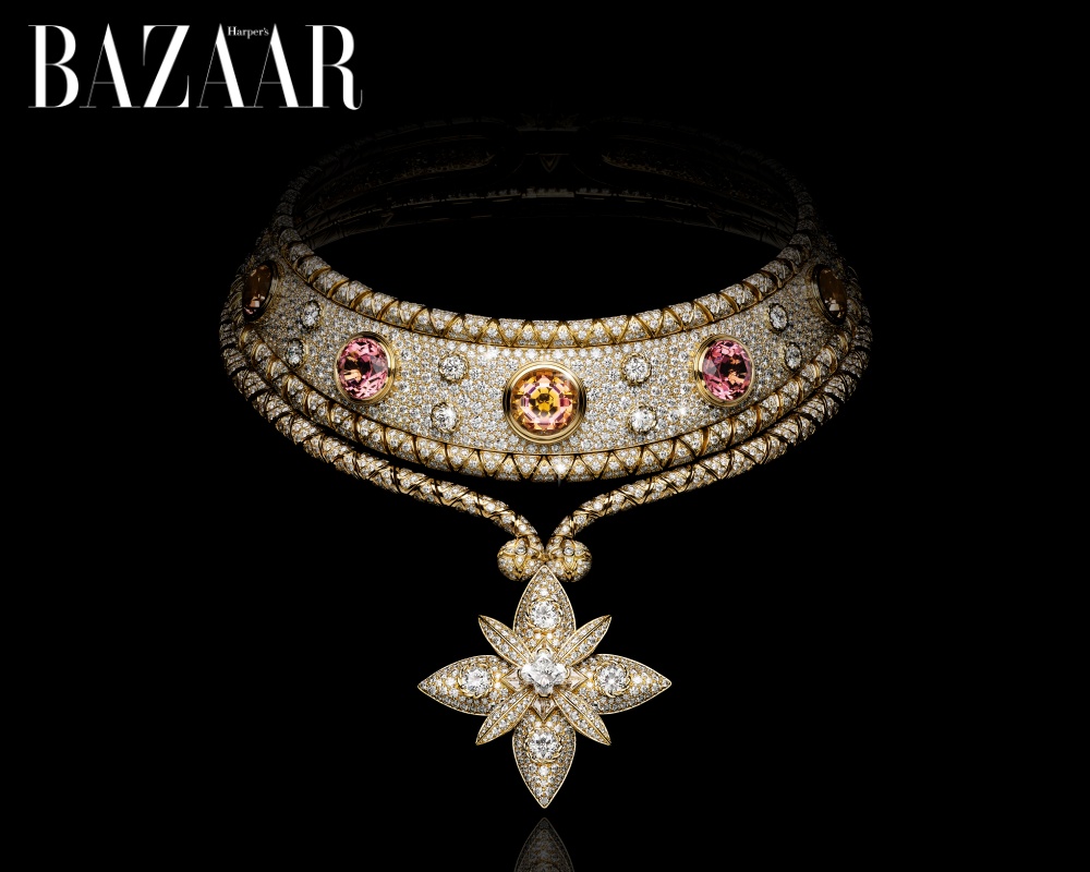 Vòng cổ Aura ôm trọn biểu tượng đóa hoa Monogram di sản của Louis Vuitton, được tô điểm bằng các viên tourmaline với tổng trọng lượng 48.06 carat. Vòng có thể biến hóa theo ba cách đeo khác nhau, chế tác từ vàng vàng và vàng trắng, đính tourmaline hồng, hồng cam và cam hồng – nổi bật với mặt dây họa tiết hoa Monogram, được hoàn thiện bằng viên kim cương 2.54 carat cắt theo dáng hoa Monogram đặc trưng.