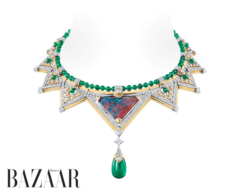 Vòng cổ Savoir, tâm điểm là viên opal Úc nặng 30.56 carat và ngọc lục bảo nặng 28.01 carat.