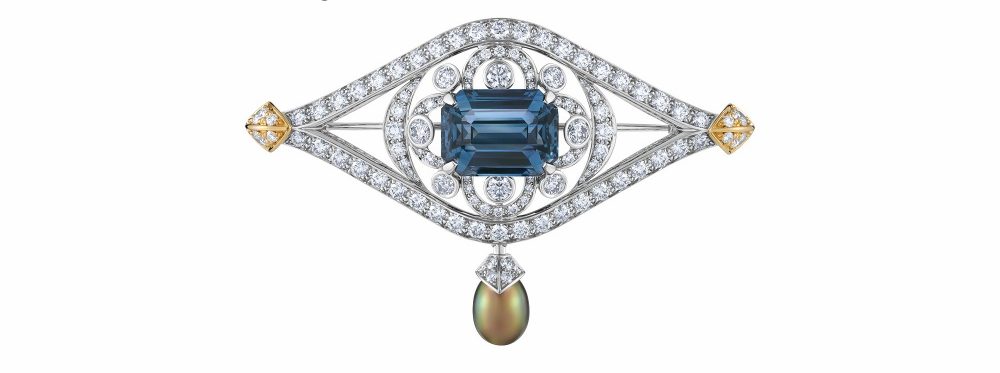 Trâm cài Keeper, tâm điểm là viên sapphire nặng 12.44 carat và ngọc trai 3.17 carat và kim cương.