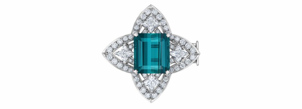 Trâm cài Florescence, tâm điểm là viên tourmaline nặng 8.18 carat và kim cương giác cắt LV Monogram Star độc quyền.