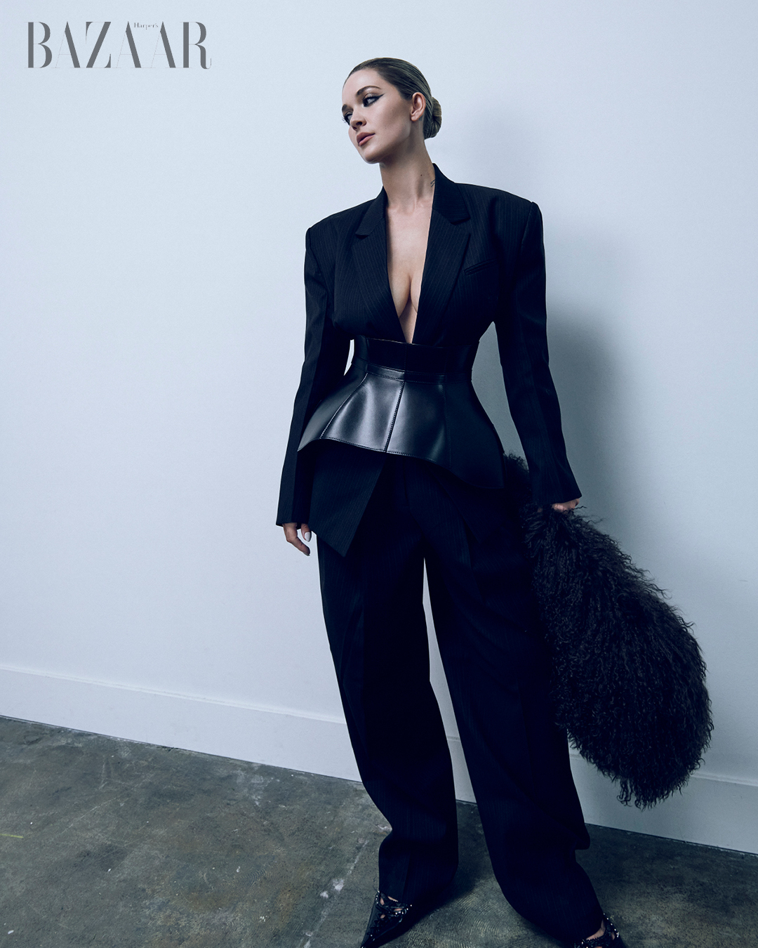 Bộ suit: TheFrankieShop. Dây lưng và túi xách: Santa Brands.