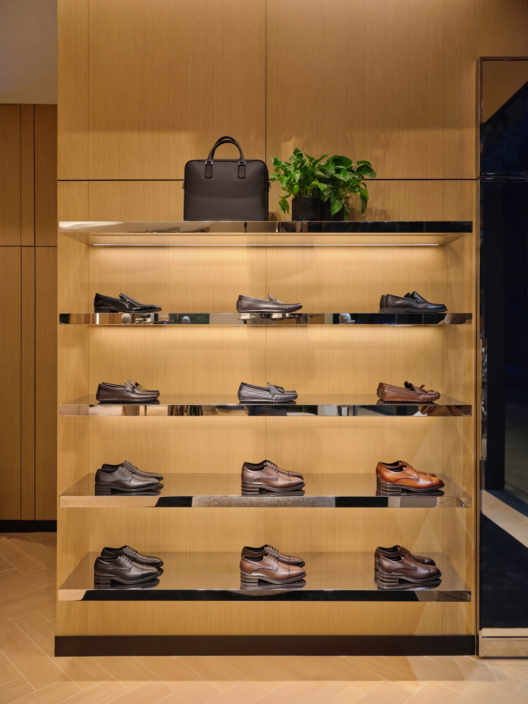 Bên trong cửa hàng, nội thất là sự hòa quyện giữa các chất liệu gỗ, đá travertine và các yếu tố kim loại cùng bề mặt bóng bẩy tạo bầu không khí cân bằng giữa sự ấm áp và tính hiện đại.