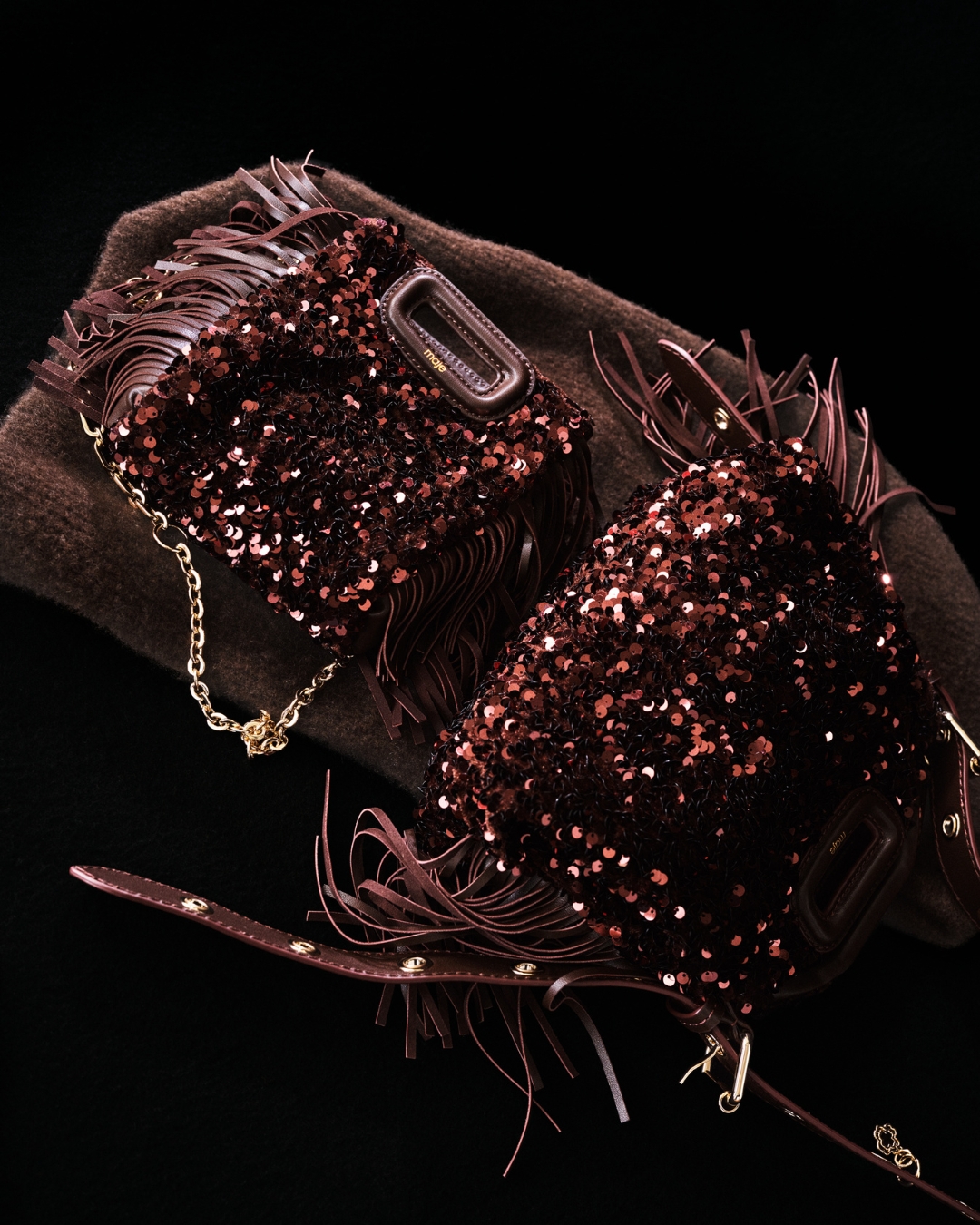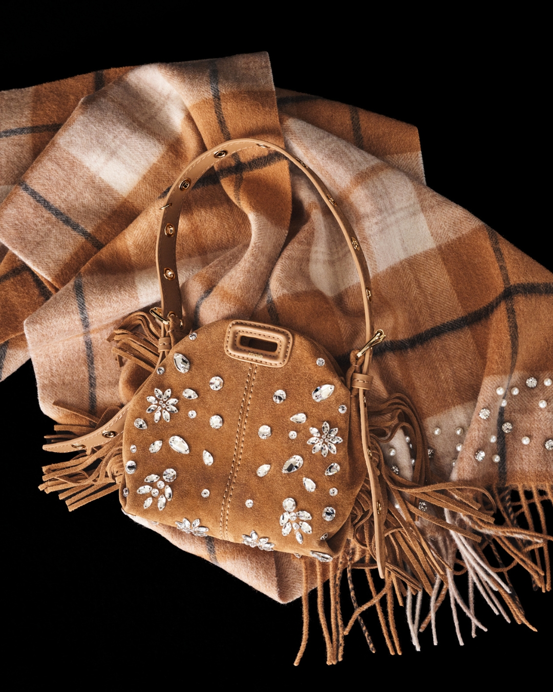 Cho mùa lạnh, không thể thiếu những chiếc túi da lộn. Maje mang trở lại túi M Bag trứ danh trên nền da lộn nâu sang trọng đính đá lấp lánh đúng với chủ đề BST.