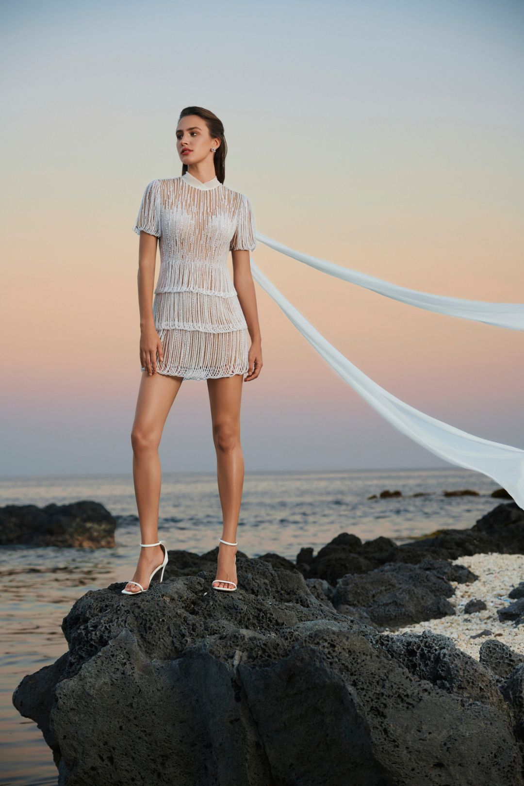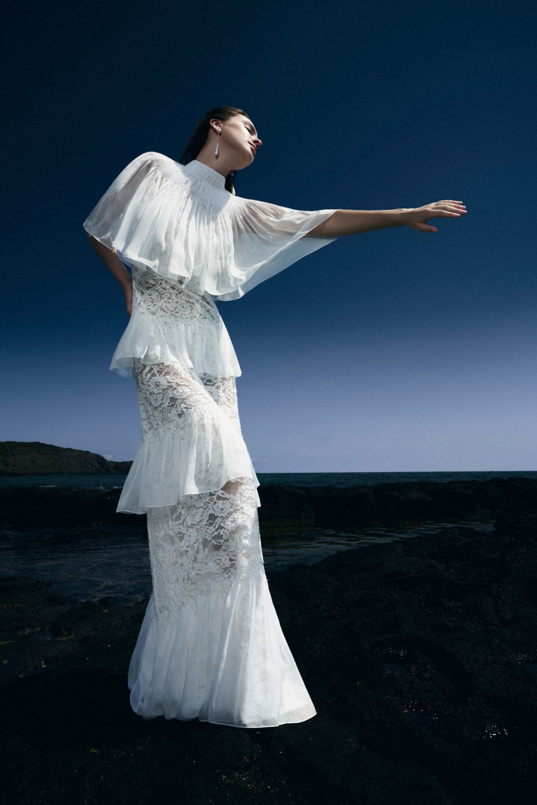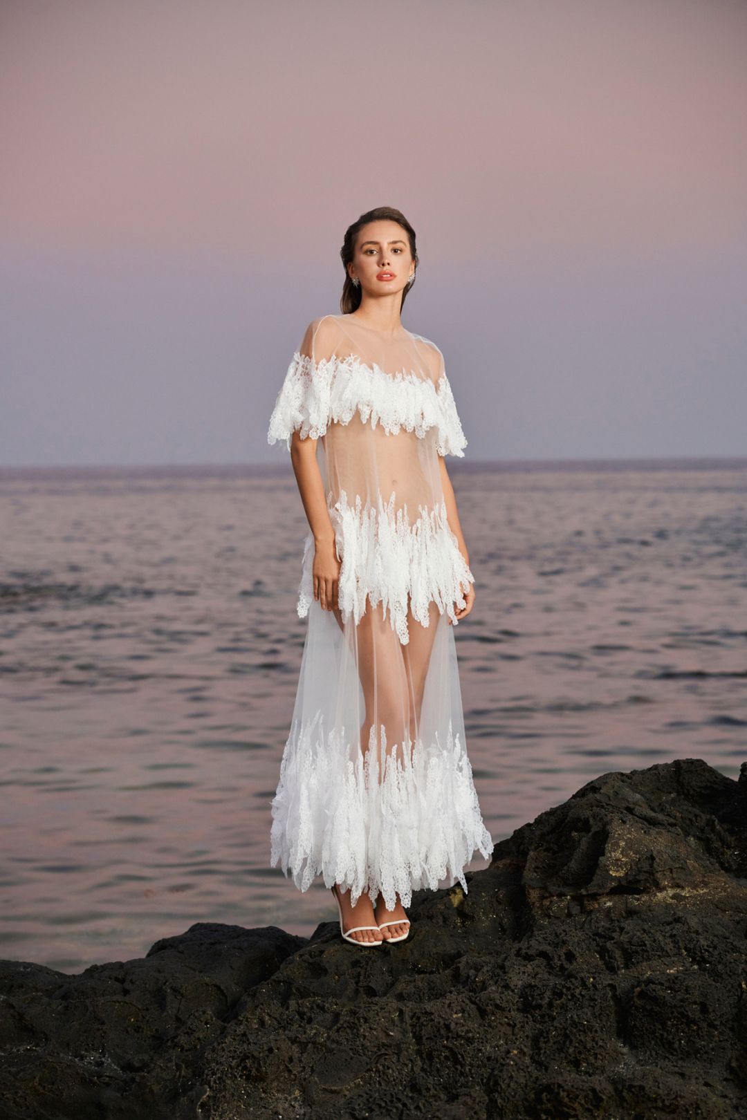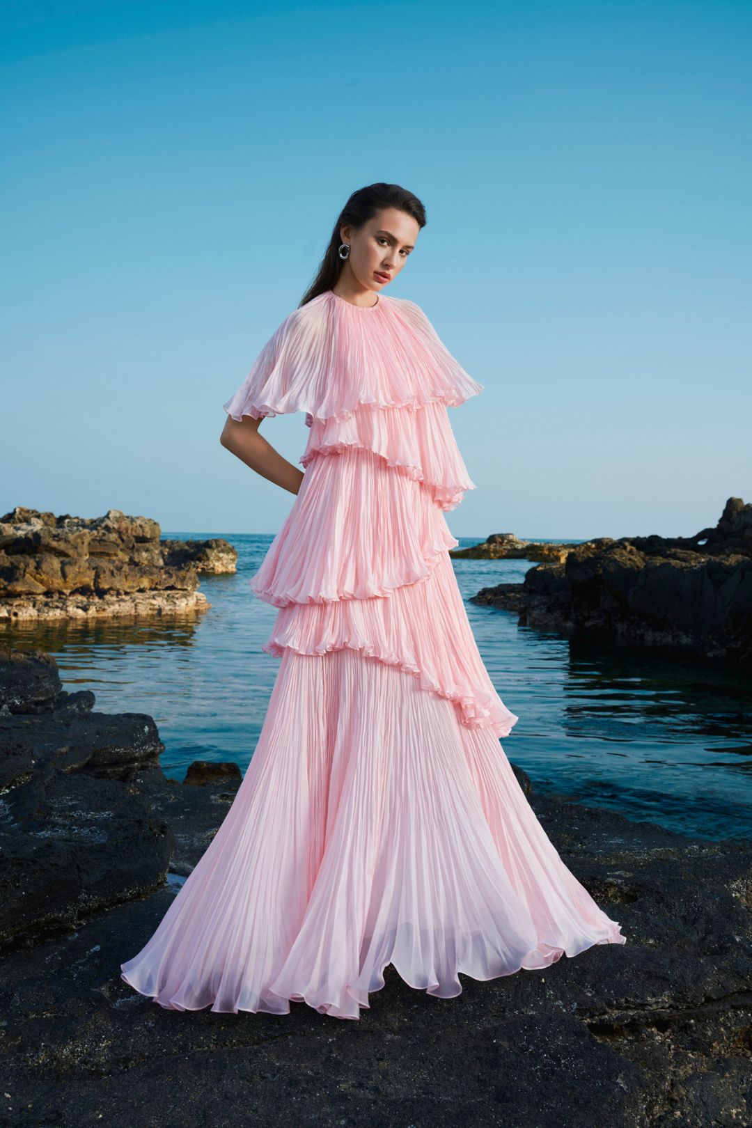 Sự bay bổng của tầng lớp: Kỹ thuật xếp lớp (layering) được ứng dụng khéo léo trên các thiết kế váy tầng. Mỗi khi người mẫu chuyển động, những lớp vải mềm mại đung đưa theo nhịp điệu, gợi liên tưởng đến những con sóng nhỏ lăn tăn trên mặt biển lặng tờ.