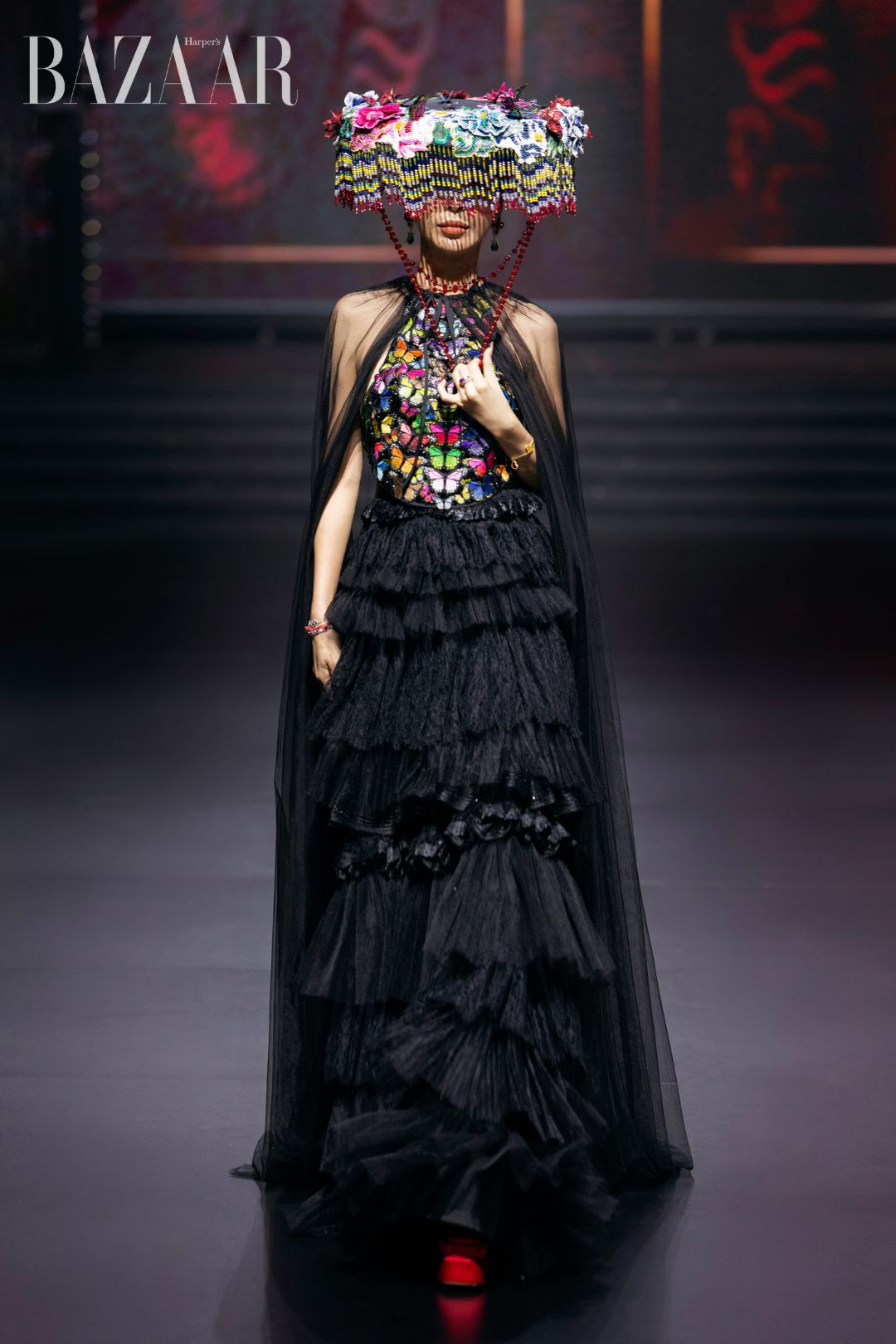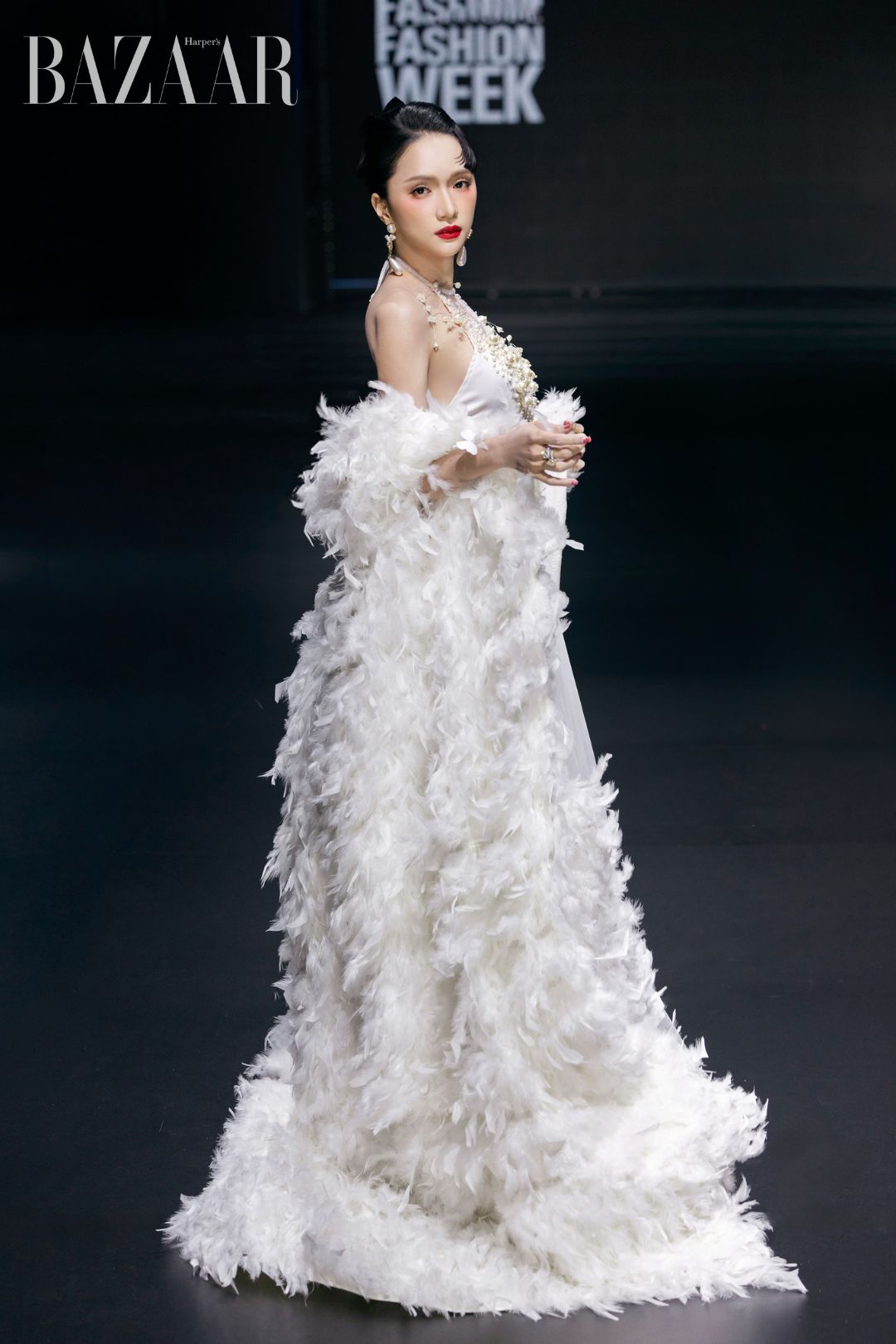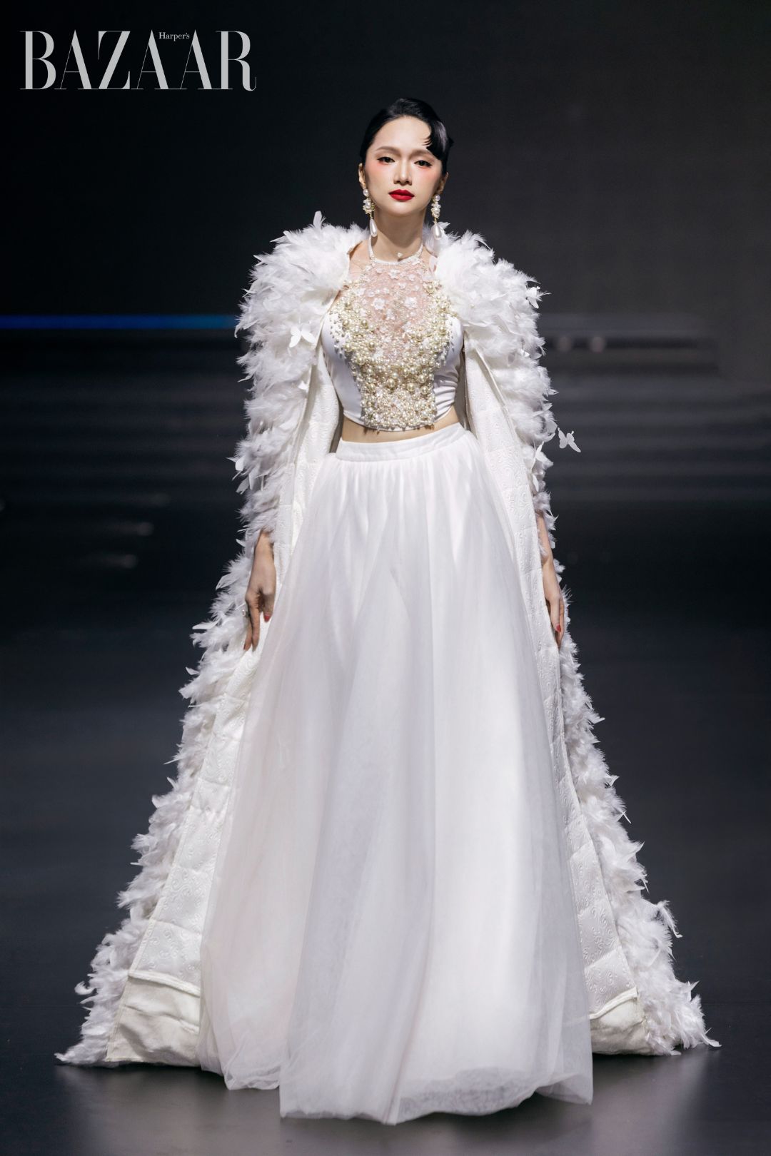 Đặc biệt, sự xuất hiện của Hoa hậu Hương Giang đã khiến không gian khán phòng thêm phần bùng nổ trong những tràng pháo tay không ngớt. Cô trình diễn thiết kế cách điệu từ áo yếm thêu tay, đính kết đá lấp lánh bởi đôi bàn tay của những người thợ lành nghề và áo choàng lông vũ. Hương Giang như hiện thân của vẻ đẹp uy quyền, quyến rũ và đầy mê hoặc.