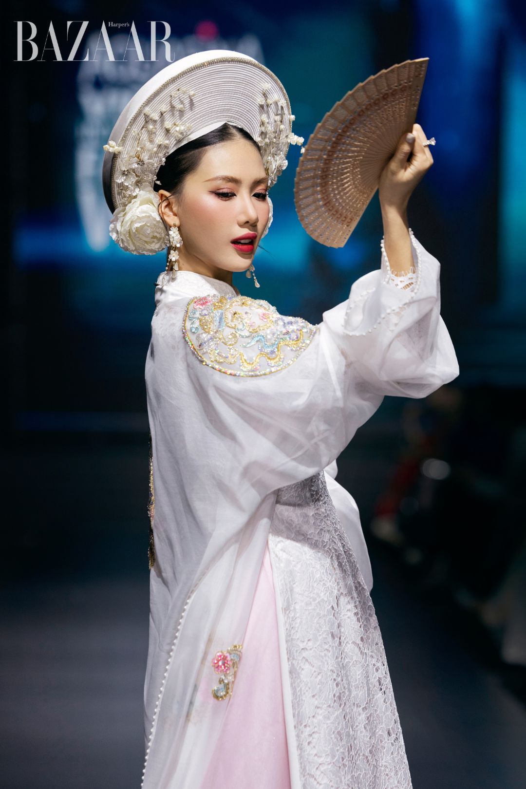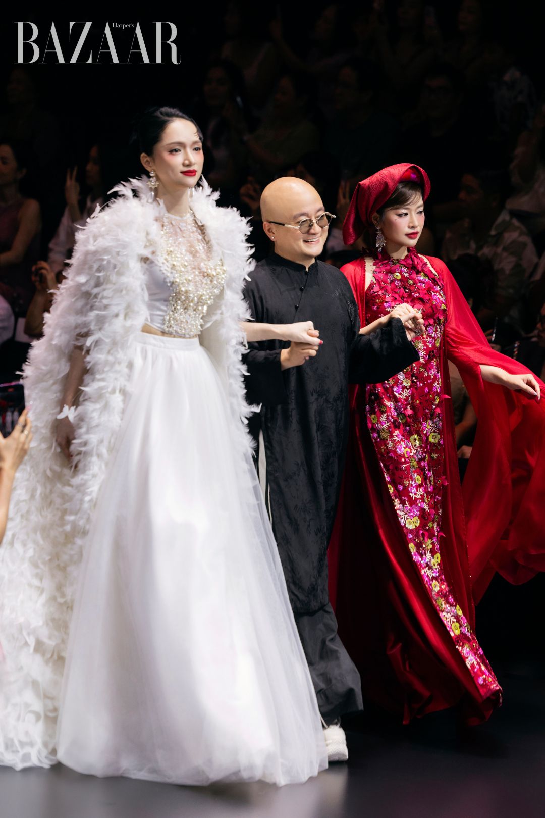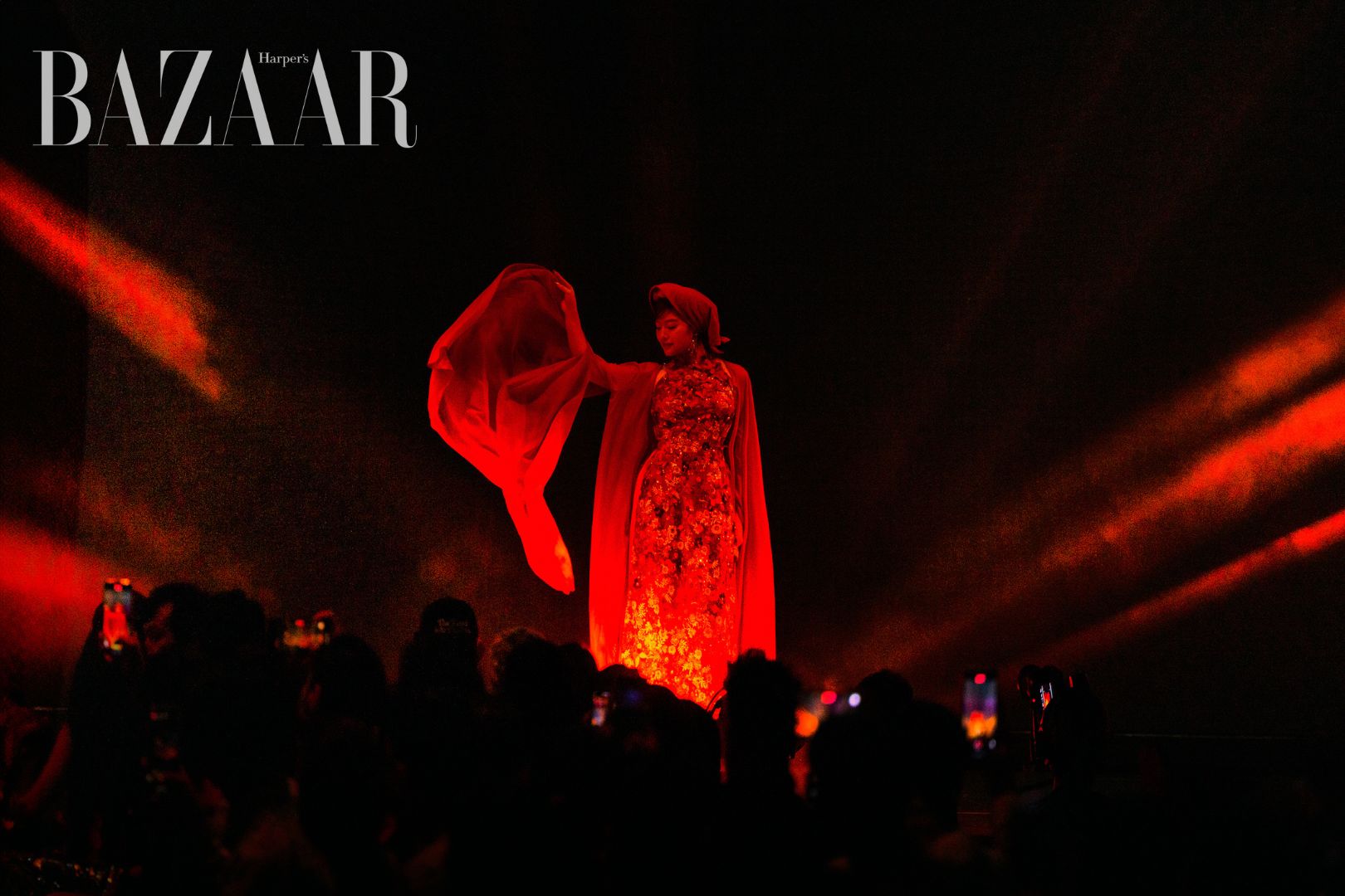 Đặc biệt, sự xuất hiện của Hoa hậu Hương Giang đã khiến không gian khán phòng thêm phần bùng nổ trong những tràng pháo tay không ngớt. Cô trình diễn thiết kế cách điệu từ áo yếm thêu tay, đính kết đá lấp lánh bởi đôi bàn tay của những người thợ lành nghề và áo choàng lông vũ. Hương Giang như hiện thân của vẻ đẹp uy quyền, quyến rũ và đầy mê hoặc.