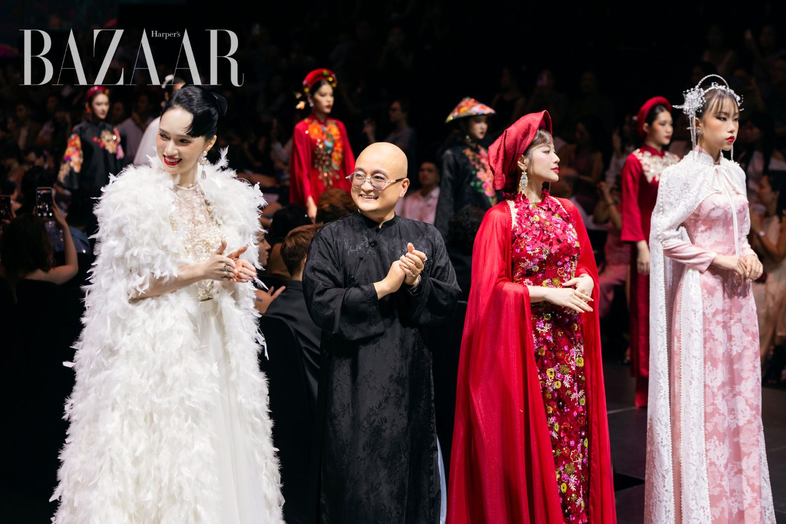 Harper’s Bazaar Việt Nam gặp gỡ NTK Cao Minh Tiến ở hậu trường chỉ vài tiếng trước khi show diễn bắt đầu, anh đang hoàn tất những bước chuẩn bị cuối cùng, cùng đội ngũ giúp các người mẫu đội những chiếc nón ba tầm, tươm tất những tà áo. Dù hồi hộp và tất bật vì đã 11 năm rồi mới ra mắt BST ở TP. Hồ Chí Minh, anh vẫn giữ cho phòng thử đồ chỉn chu và nhẹ nhàng khi vận chuyển những thiết kế thêu tay. Chúng tôi có thể thấy rõ sự trân quý của anh dành cho những thiết kế đang mang trên mình nét đẹp văn hoá Việt.
