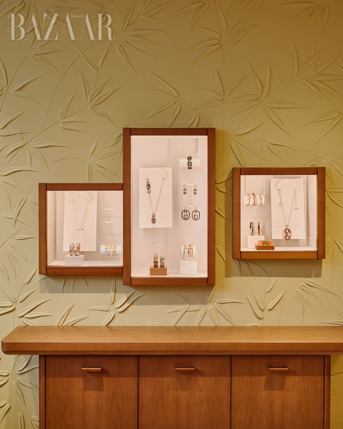Khu vực dành cho trang sức và đồng hồ được trải ra trong một không gian rực rỡ với thảm trải sàn mang họa tiết ombre lấy cảm hứng từ những thửa ruộng bậc thang. Không gian này dẫn lối đến khu trưng bày giày, nơi phân chia khu vực sản phẩm cho nam và trang phục may sẵn cho nữ, với màu sắc chuyển tông từ xanh lá sang vàng.