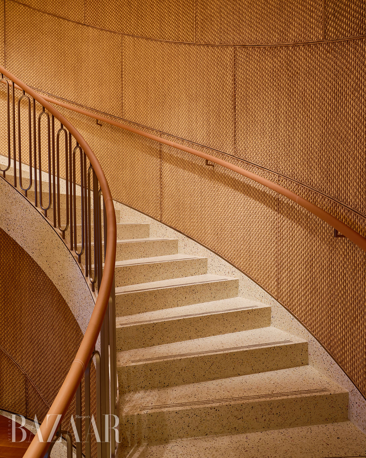 Khu vực cầu thang được ốp chất liệu mây đan thủ công, có lan can bằng kim loại mạ vàng kết hợp da uốn mình nhẹ nhàng theo hình xoắn ốc.