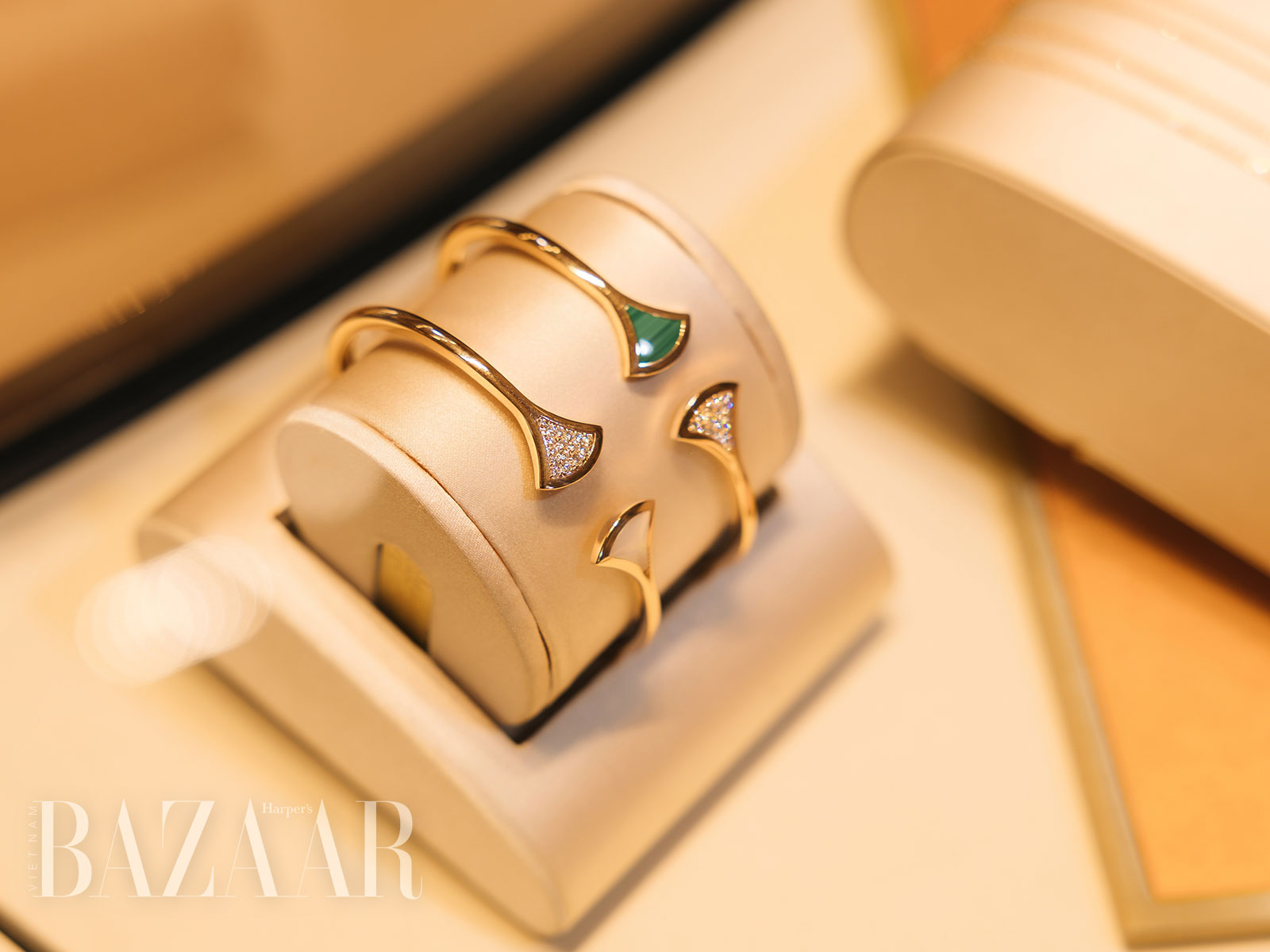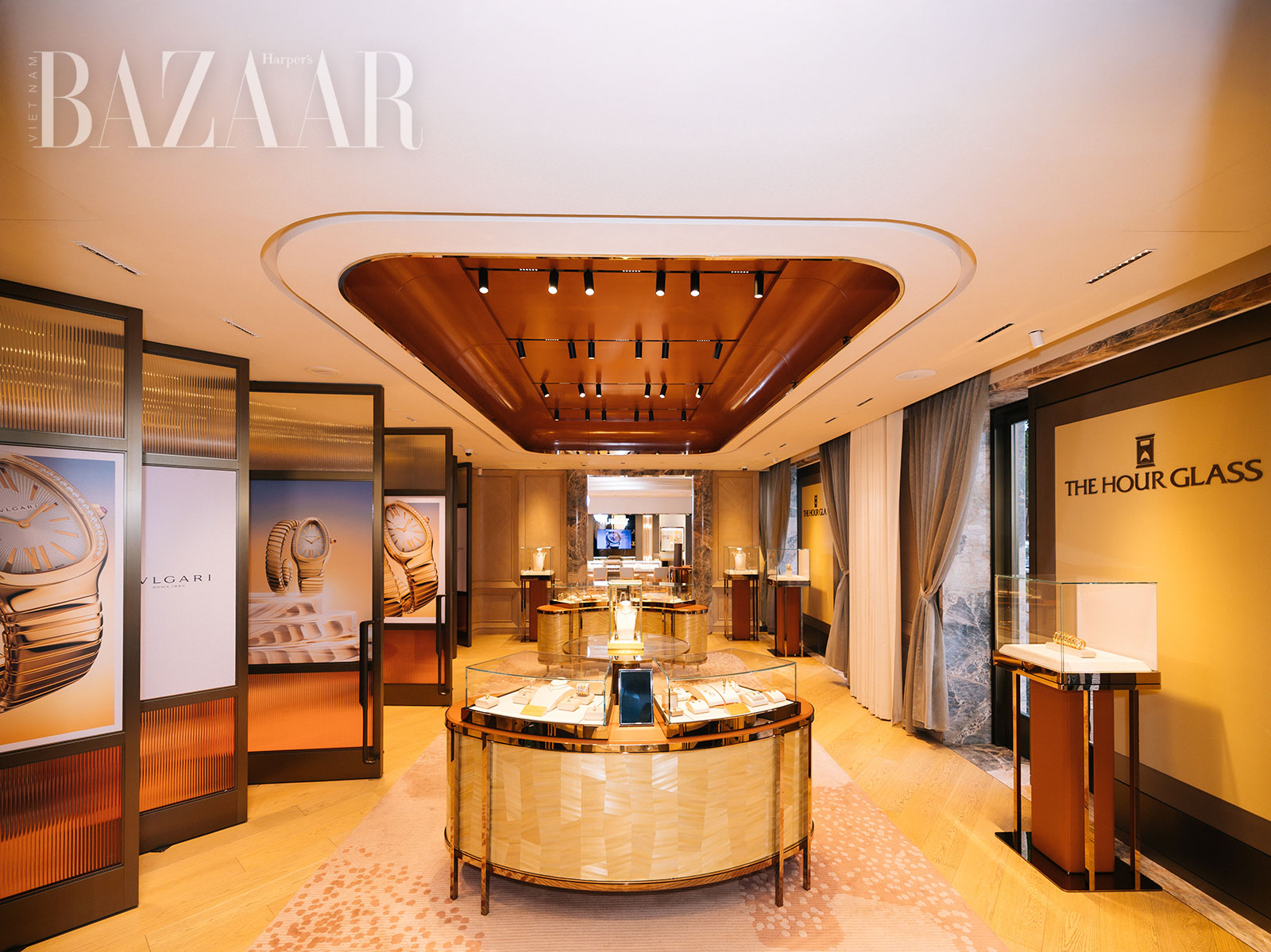 Trong khu vực trưng bày trang sức của BVLGARI ở The Hour Glass Opera Hà Nội, vẻ đẹp tinh tế và giá trị vượt thời gian được thể hiện qua từng đường nét thủ công tỉ mỉ trên các mẫu trang sức biểu tượng Serpenti, Divas’ Dream, và B.Zero1.