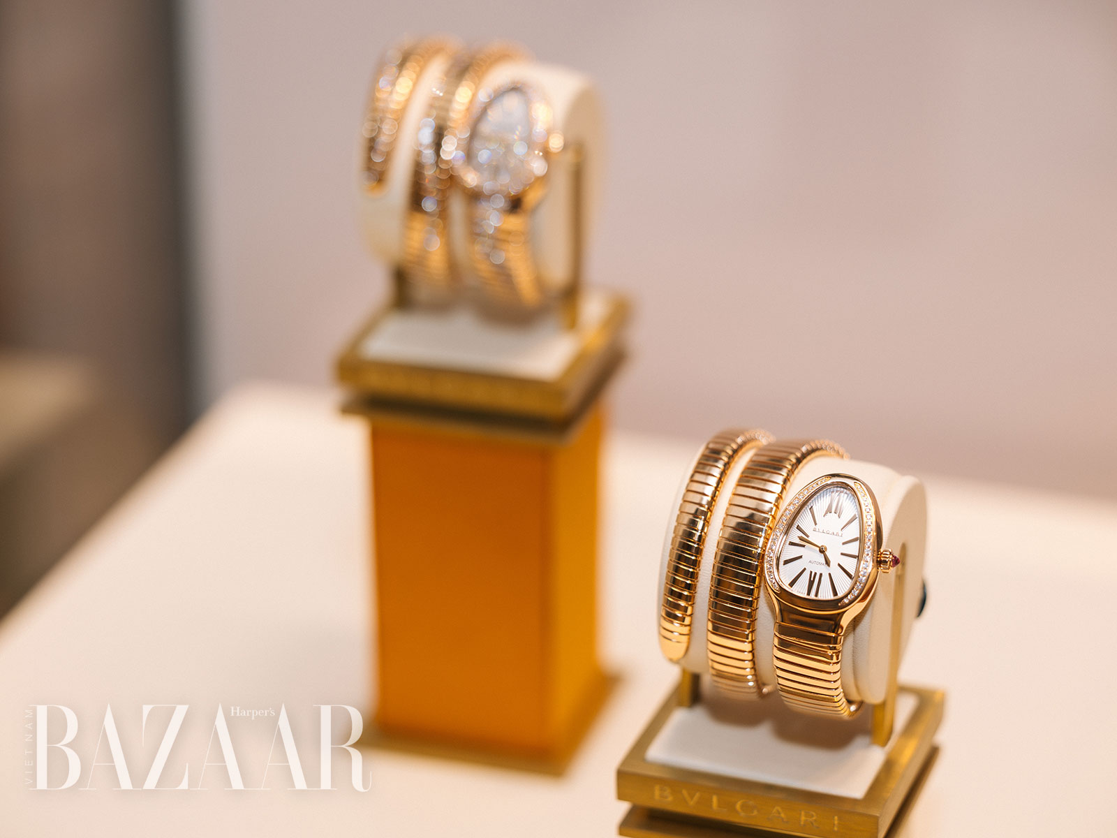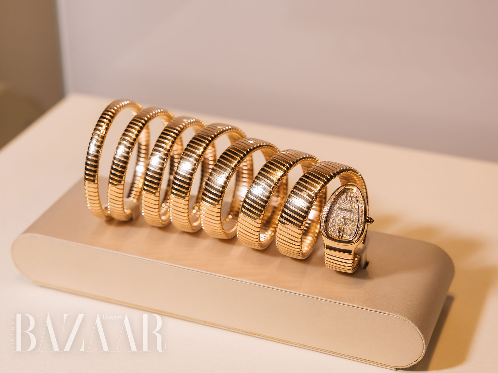 Chiếc đồng hồ Serpenti Tubogas chính là ngôi sao của triển lãm của BVLGARI tại The Hour Glass Opera Hà Nội. Tại triển lãm, thương hiệu Ý trình làng nhiều phiên bản khác nhau, từ mẫu với vỏ vàng hồng 18K và mặt số nạm kim cương rực rỡ, ôm sát làm nổi bật cánh tay thon thả của người phụ nữ, cho đến đến phiên bản dây quấn hai vòng tạo hình uyển chuyển đặc trưng.