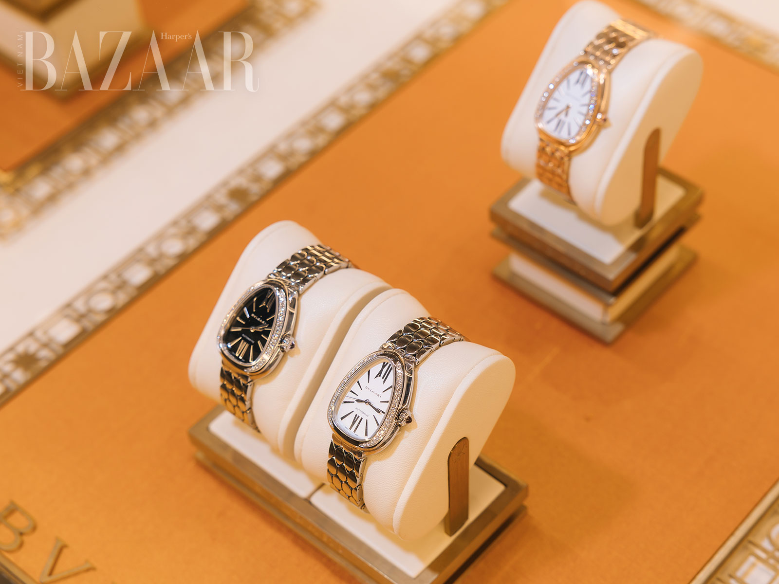 Hai mẫu đồng hồ cơ tự động Serpenti Tubogas và Serpenti Seduttori, với viền bezel nạm kim cương và mặt số opaline trắng thanh lịch, tiếp tục khẳng định ngôn ngữ thiết kế hiện đại và vị thế dẫn đầu của BVLGARI trong thế giới chế tác đồng hồ cao cấp (haute horlogerie).