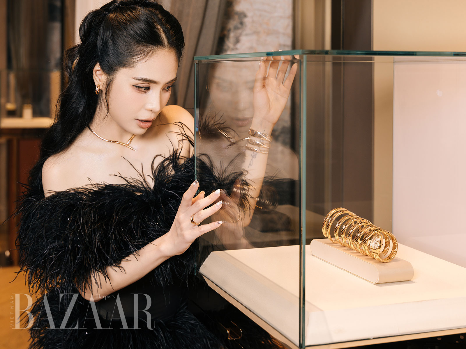 Ca nương Kiều Anh chiêm ngưỡng mẫu đồng hồ Serpenti Tubogas. Ảnh: BVLGARI