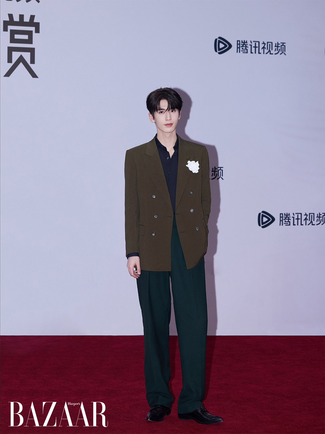 Trương Lăng Hách xuất hiện trong bộ suit xanh đậm thuộc BST menswear Xuân 2026 của Tom Ford. Một bông hoa hồng gài trên ngực, boutonnière trong tiếng Pháp, mang đến vẻ đẹp lãng tử đậm tinh thần châu Âu.