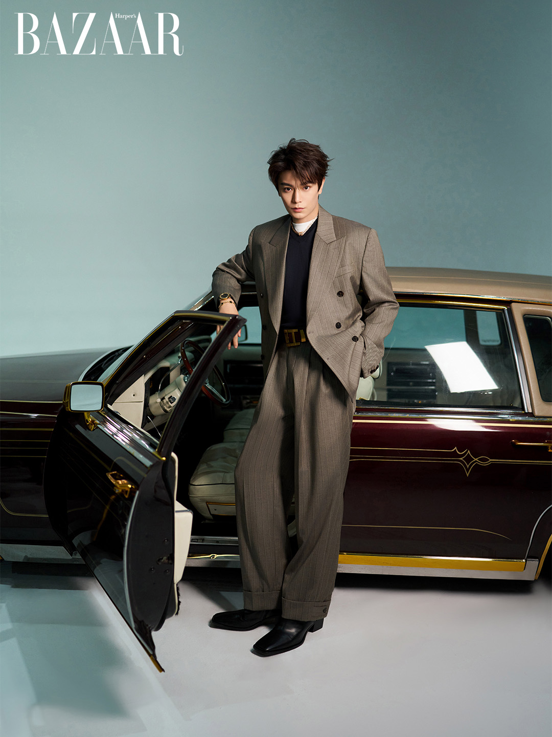 Trong bộ suit dáng rộng màu trầm thuộc BST Versace Xuân Hè 2026, Đinh Vũ Hề như một quý ông bước ra từ kỷ nguyên vàng son của điện ảnh nước Ý. Kết hợp cùng trang sức và đồng hồ BVLGARI, Đinh Vũ Hề khiến người ta tin rằng anh sắp sửa đóng một bộ phim lấy bối cảnh châu Âu hơn là chuẩn bị bước lên thảm đỏ lễ trao giải.