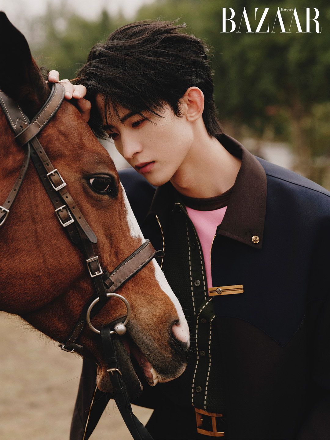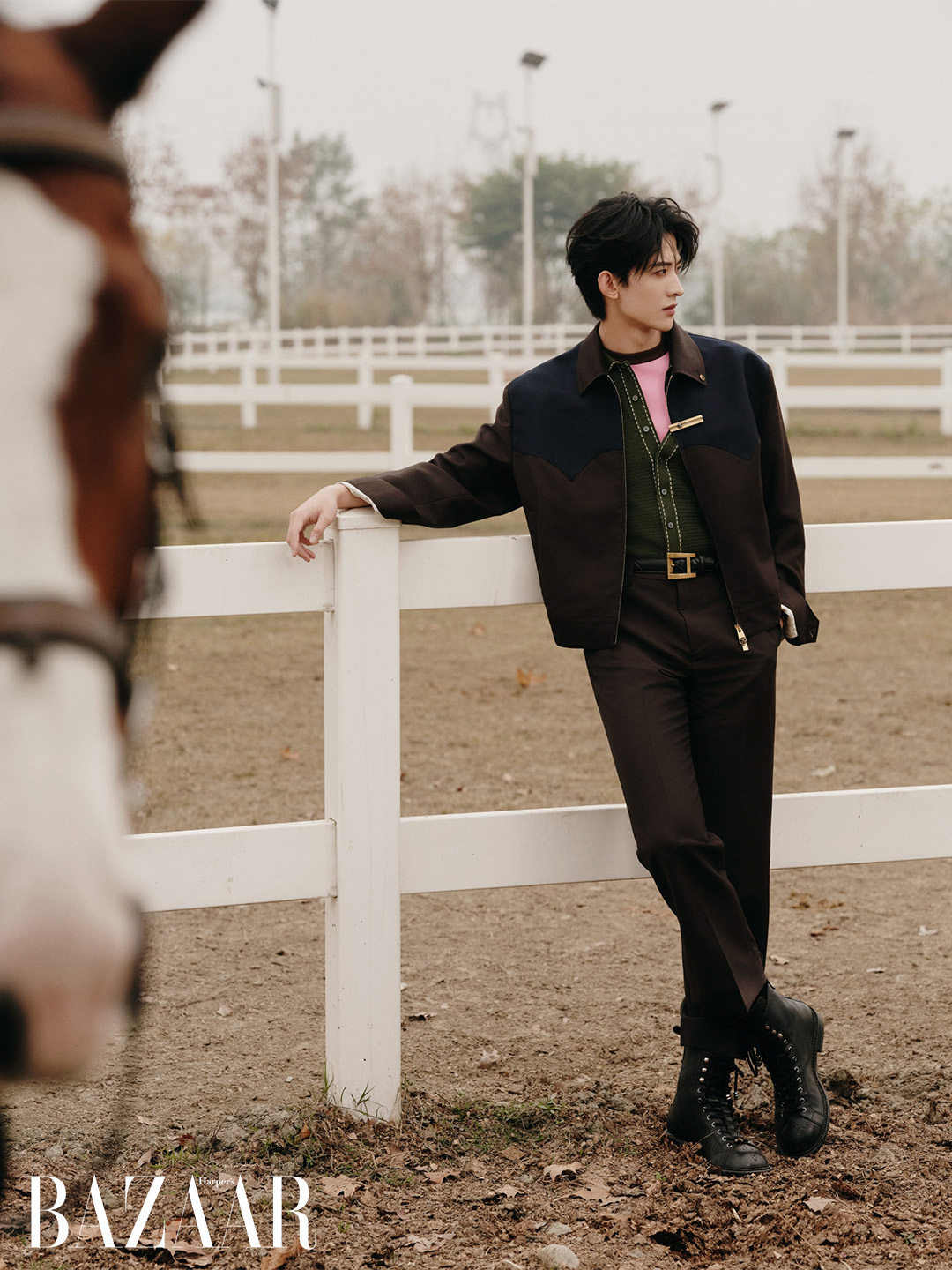 Bản phối thời trang của Thường Hoa Sâm cho thấy rõ chất preppy ảnh hưởng từ thương hiệu Miu Miu của Dario Vitale. Những lớp màu trầm, vùa đủ để tạo sự khác biệt, nhưng cùng hòa lẫn vào nhau để tạo nên hình ảnh quý ông trầm tĩnh. Một chút sự tương phản đến từ lớp áo màu hồng ở trong cùng, và đường may màu trắng nổi lên trên nền áo sơ-mi xanh.