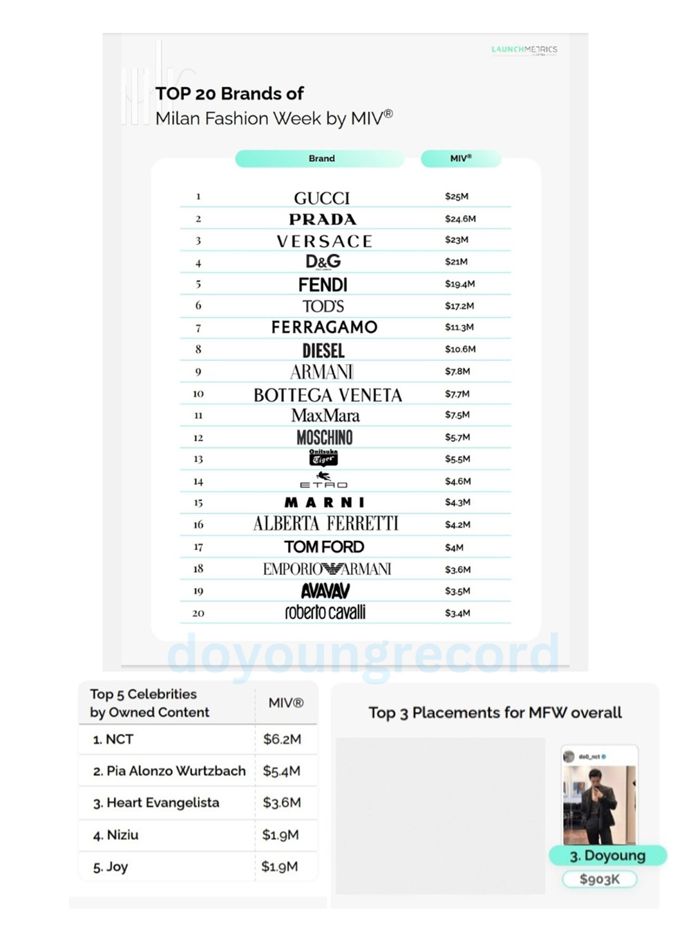 Có thể nói, Tuần lễ Thời trang Milan 2024 chính là một màn trình diễn đặc sắc về phong cách và sức ảnh hưởng của các ngôi sao châu Á. Ngoài NCT, top các ngôi sao đạt giá trị truyền thông cao đều đến từ châu Á. Đó là Miss Universe 2015 Pia Wurtzbach với 5,4 triệu đô-la Mỹ; diễn viên Philippines Heart Evangelista với 3,6 triệu đô-la Mỹ; và Niziu, nhóm nhạc nữ Nhật Bản được thành lập bởi JYP Entertainment và Sony Music Entertainment Nhật Bản, với 1,9 triệu đô-la Mỹ.