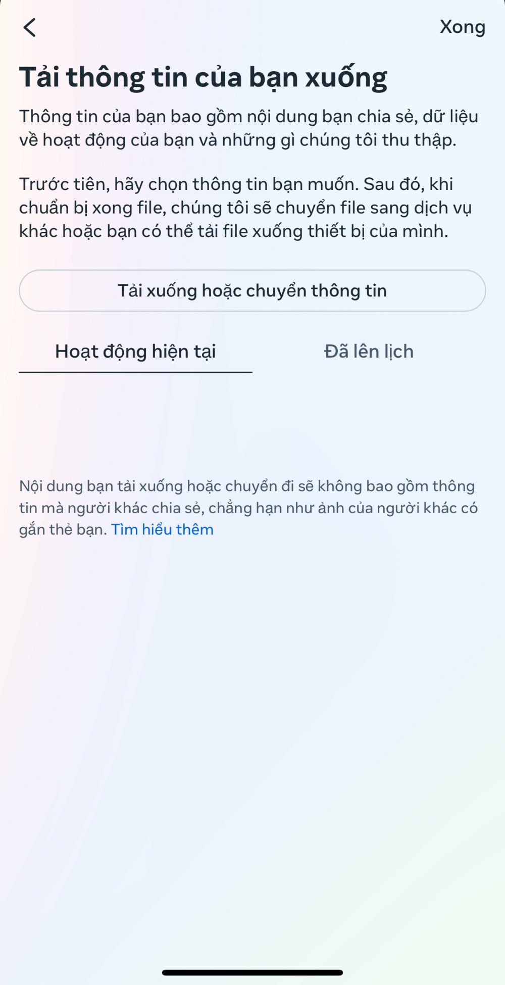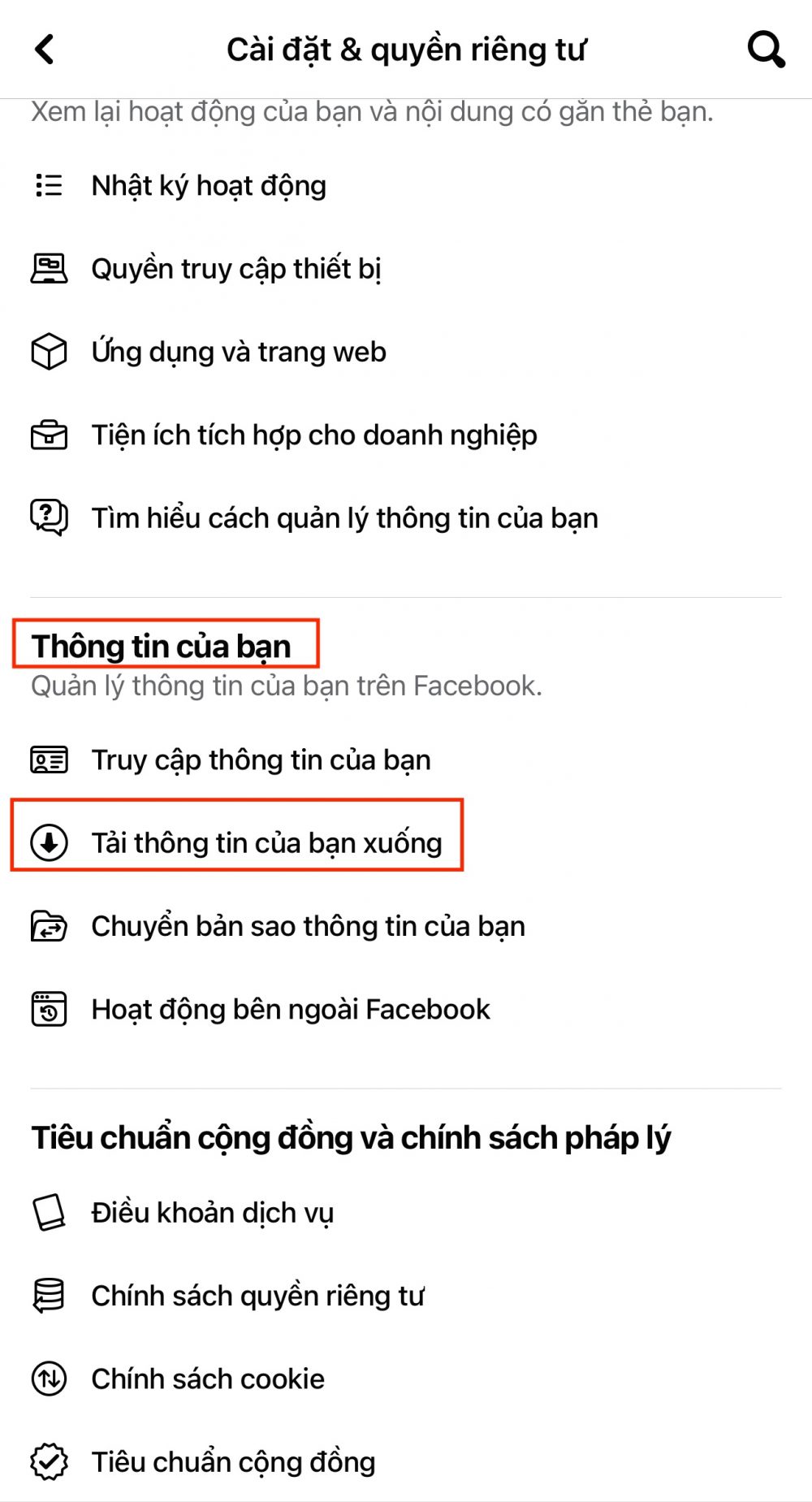 • Tương tự như với điện thoại Android, tại bước này, bạn vào mục “thông tin của bạn”, chọn “tải thông tin của bạn xuống” rồi chọn “tiếp tục” để xác nhận.