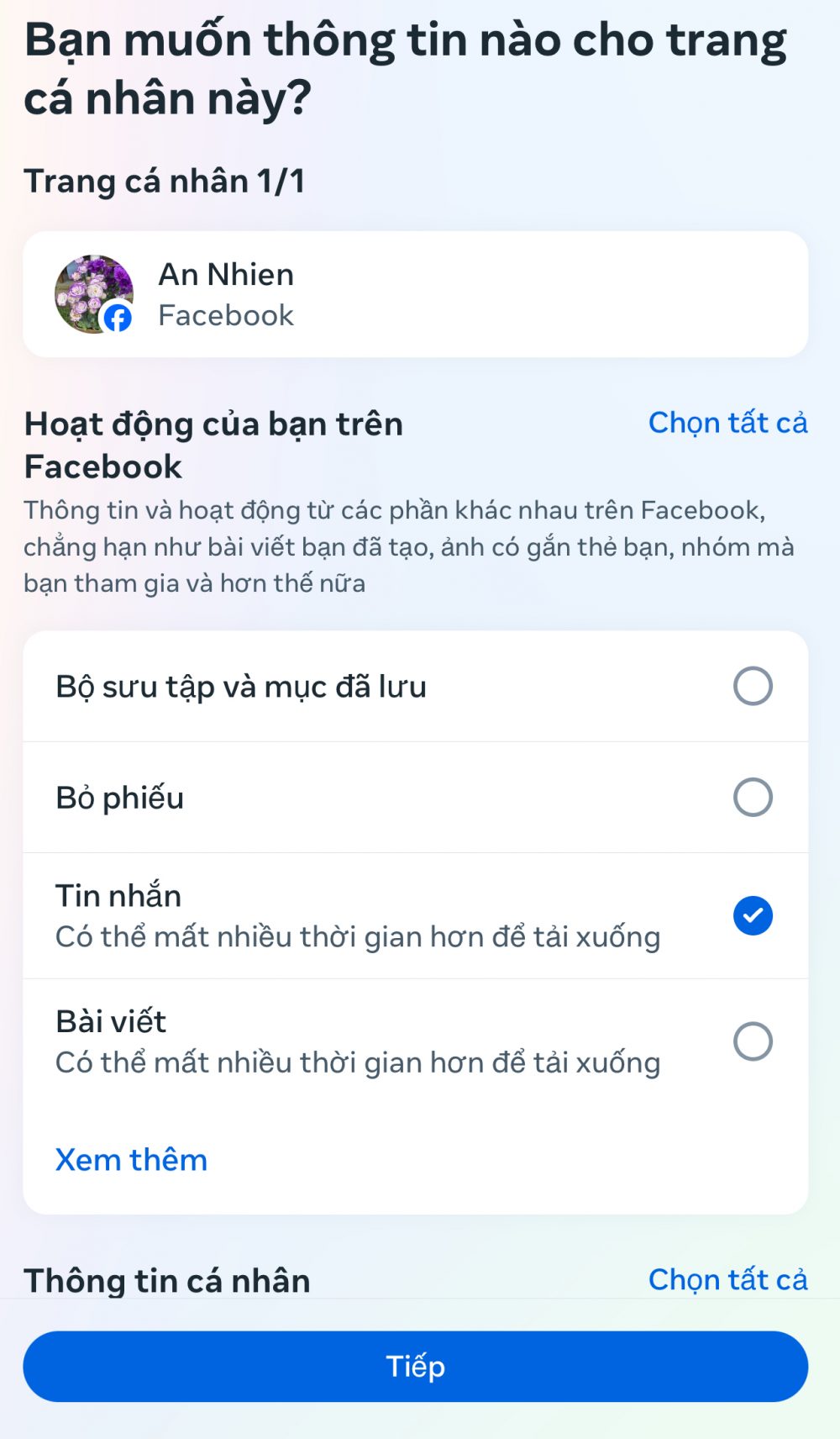 • Trong phần “chọn thông tin”, bạn nhấn vào mục “chọn loại thông tin”. Tiếp theo hãy tick chọn vào mục “tin nhắn” rồi chọn “tiếp”.